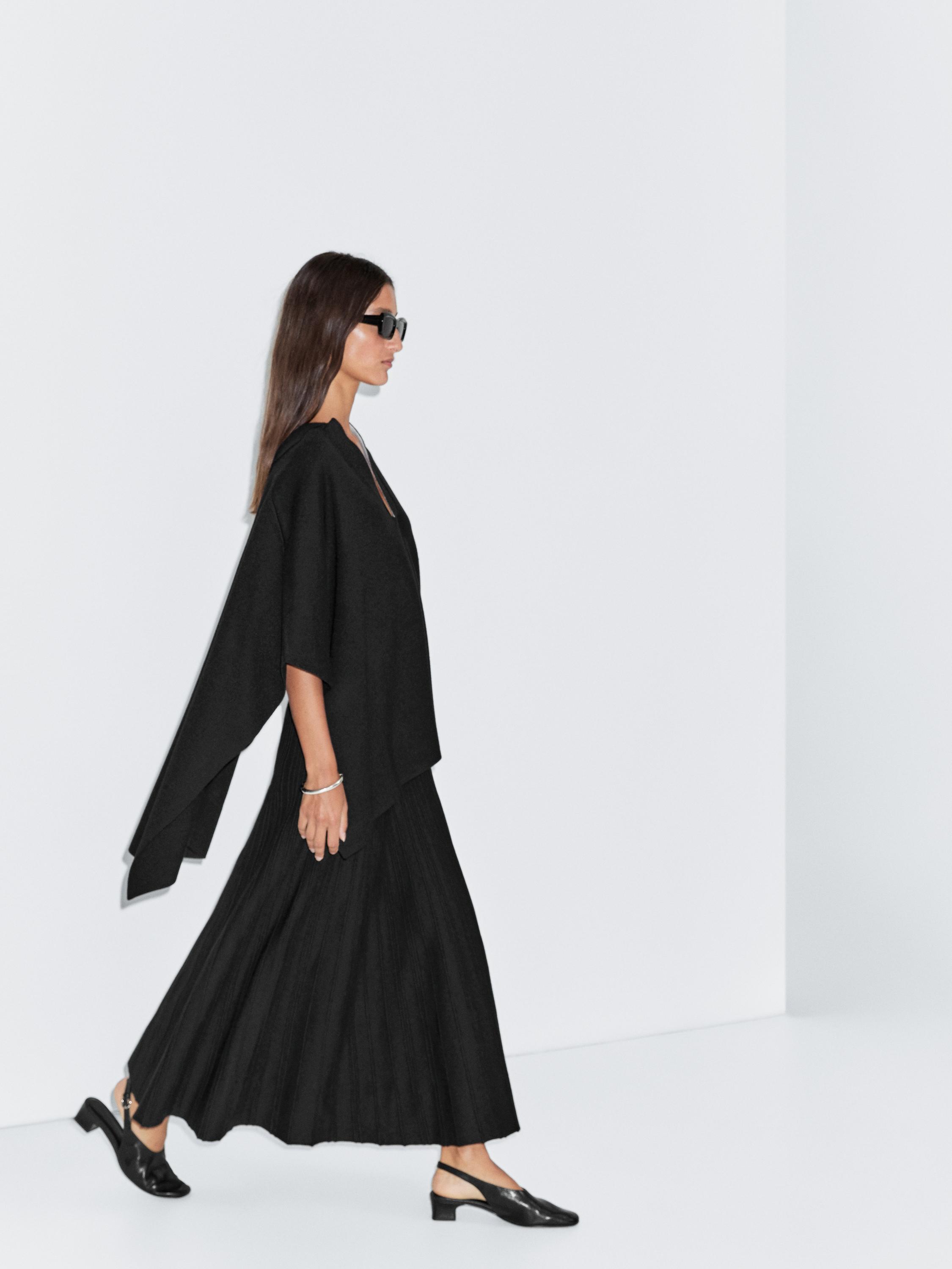 Cape made of knit fabric. Johnny collar. Matching garment available. Contrast colour detail.