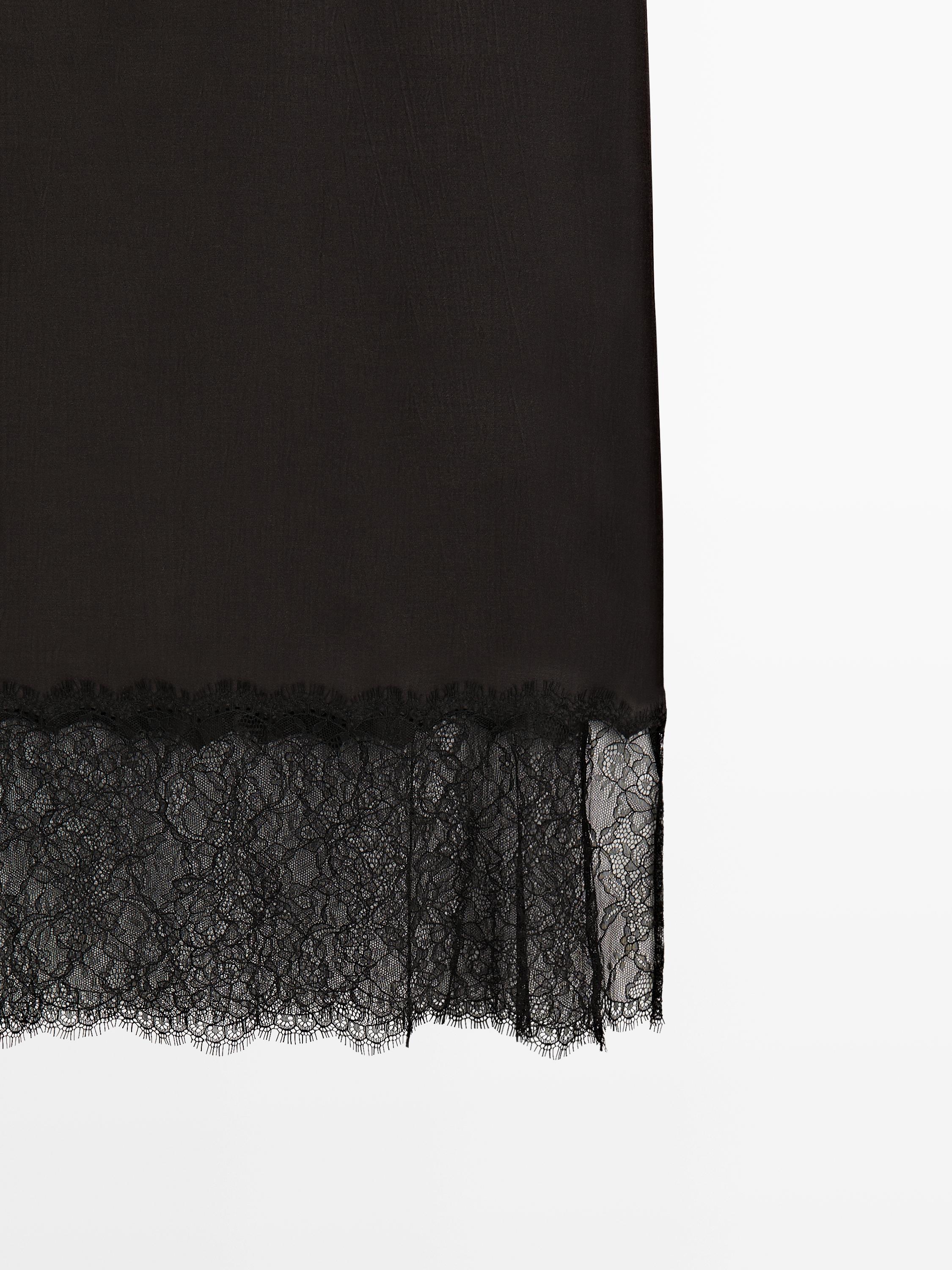 Gonna midi in tessuto satinato. Chiusura con cerniera sulla parte posteriore. Dettaglio di pizzo.