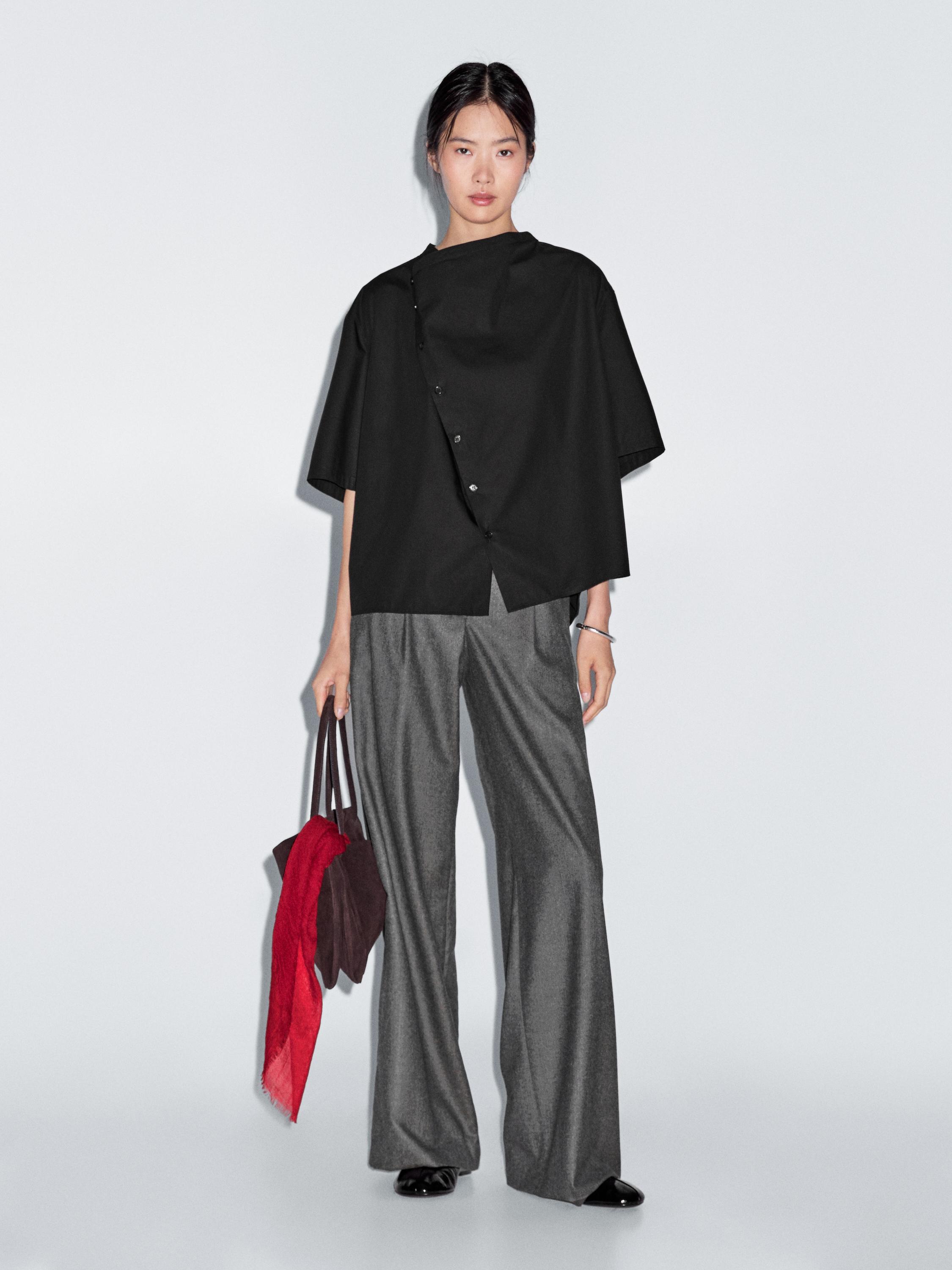 100% 면 원단 소재 셔츠. 크루넥. 반소매. 테일러드되지 않은 넓고 편안한 실루엣.