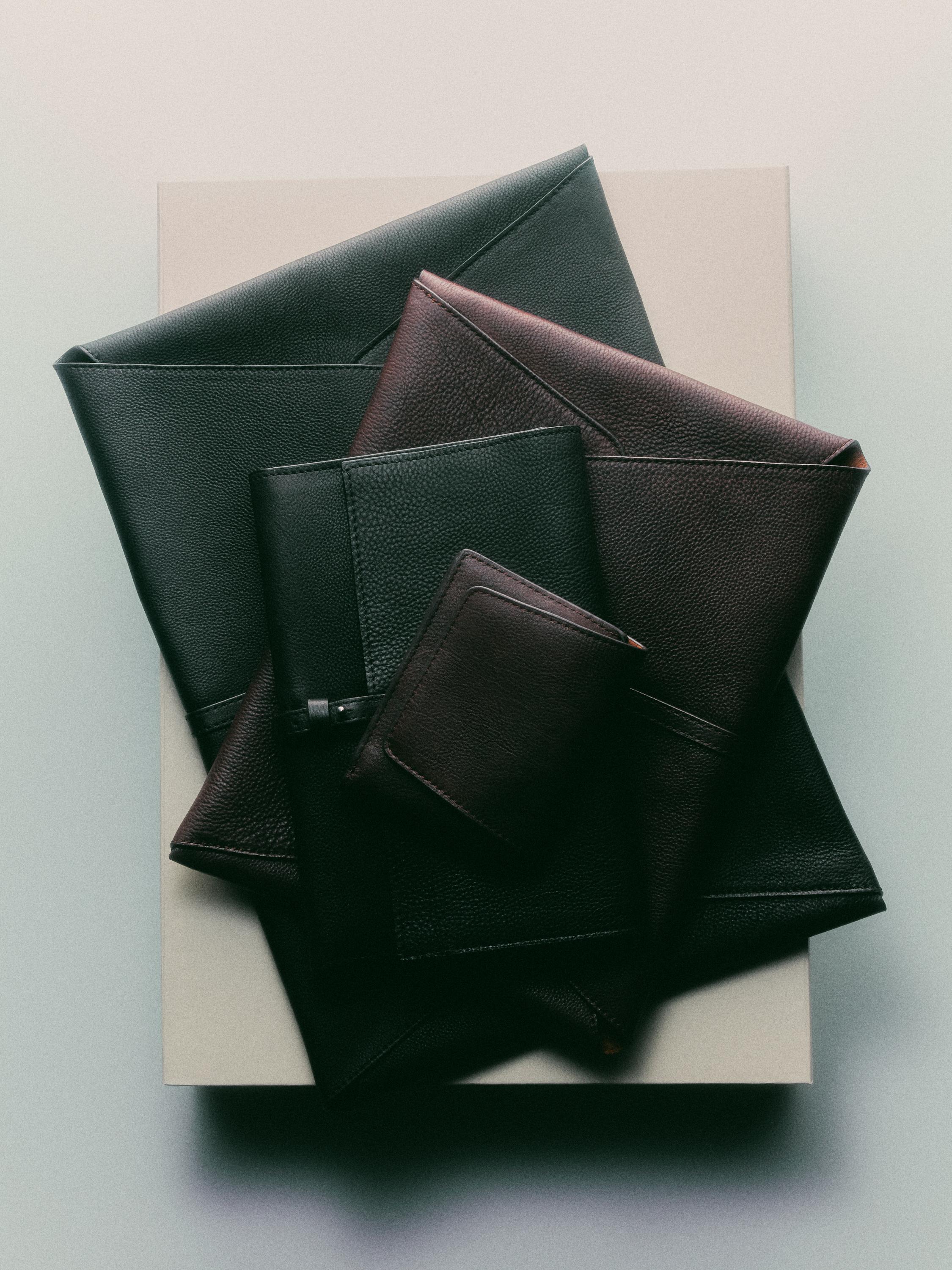 حقيبة تقنية مصنوعة من الجلد البقري بمظهر جلد النابا. مشبك معدني للإغلاق وحلقة جلدية للحزام.