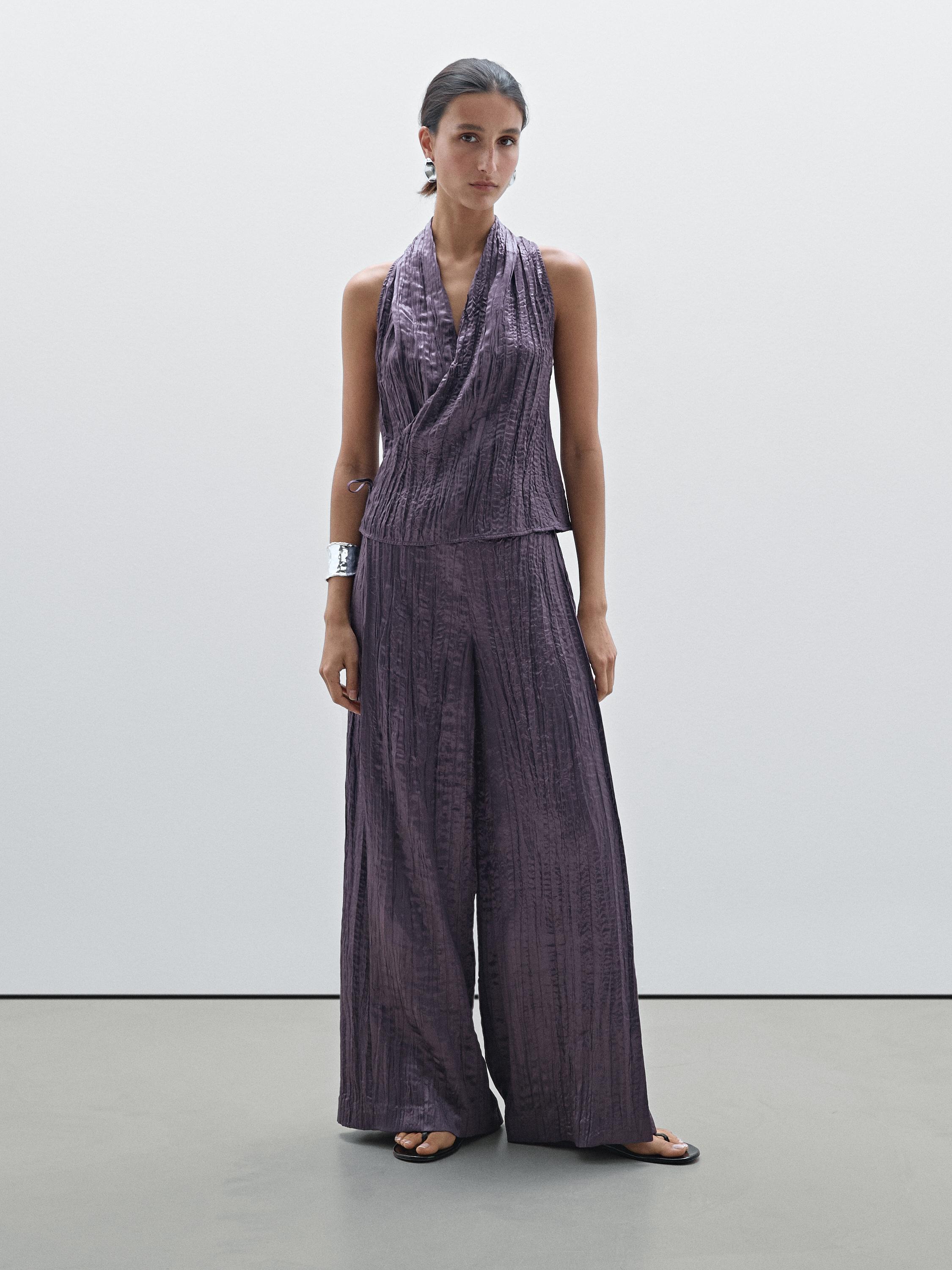 بنطلون بقصة مستقيمة. قفل بسحاب جانبي. فتحات جانبية عند الطرف. تفصيل بثنيات. نسيج فضفاض. متاح قطعة بلون مماثل.