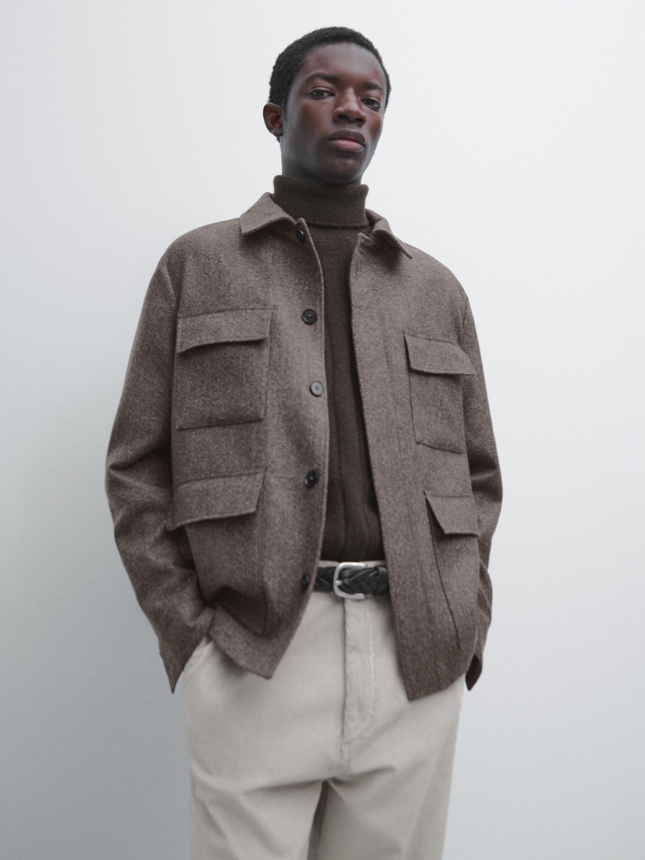 Куртка из смесовой шерсти. Длинные рукава и манжеты на пуговицах. Рубашечный воротник.