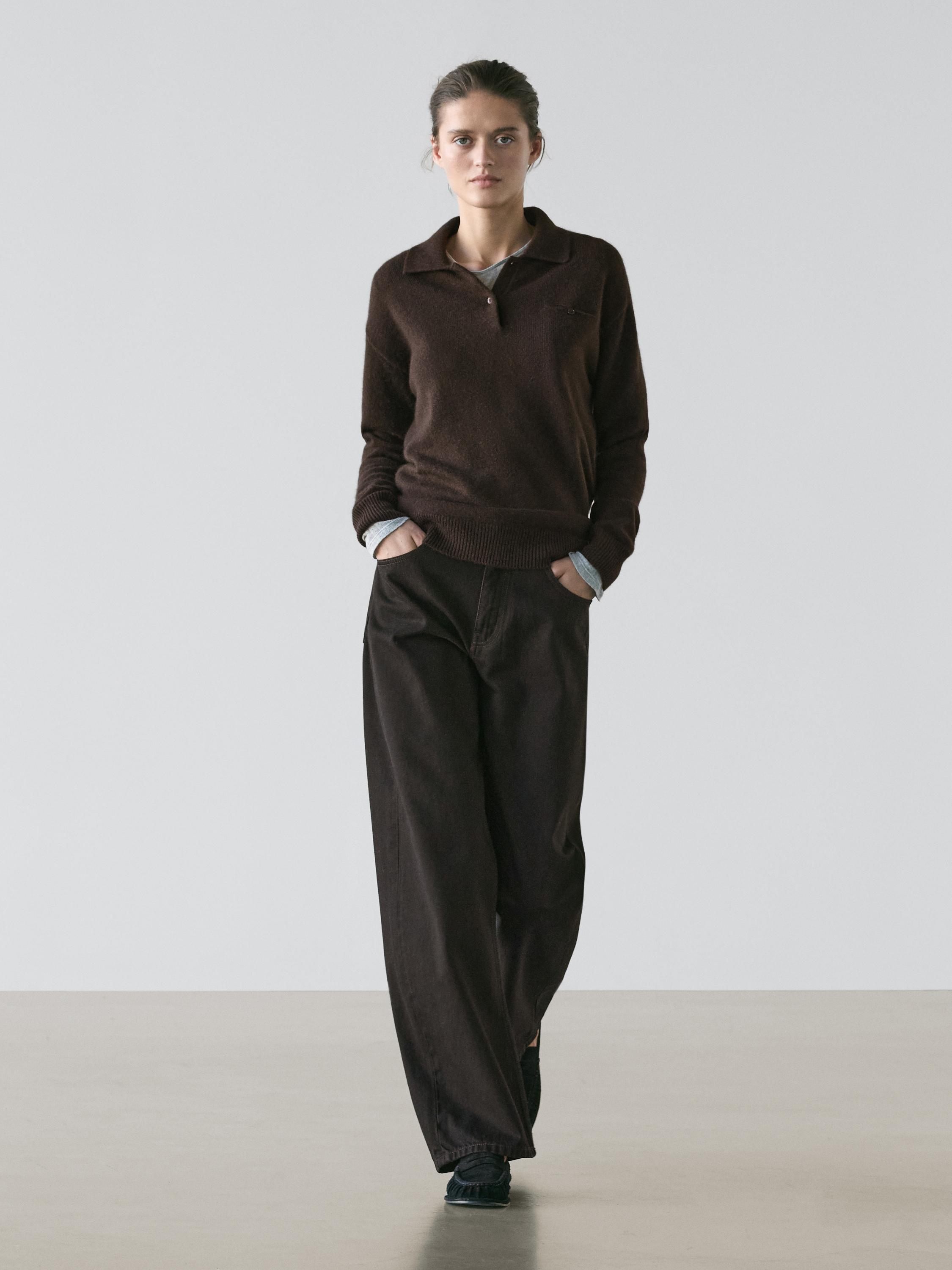 سويتر مصنوع 100% من الكشمير. أكمام طويلة. ياقة بولو بزر للإغلاق. جيب شق بزر على الصدر. طبعة مضلعة. نسيج ناعم الملمس.