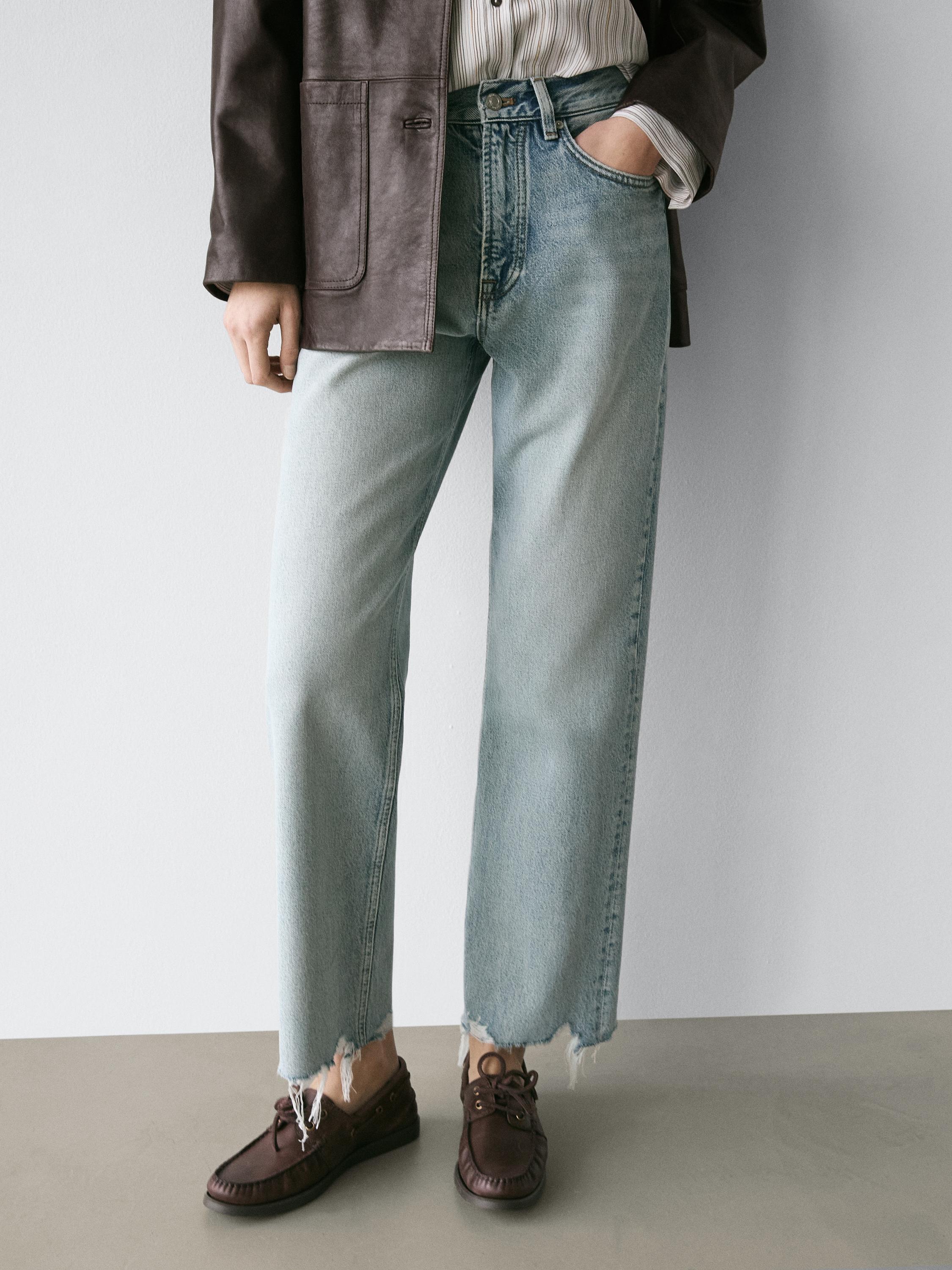 بنطال جينز بقصة ساق مستقيمة: تصميم مستقيم من الخصر إلى الكاحل، بدون أي تعديلات إضافية على الساق. تفاصيل حلقة تثبيت . سحّاب أمامي وزر علوي للإغلاق. تصميم بخمسة جيوب. طرف مشذّب.