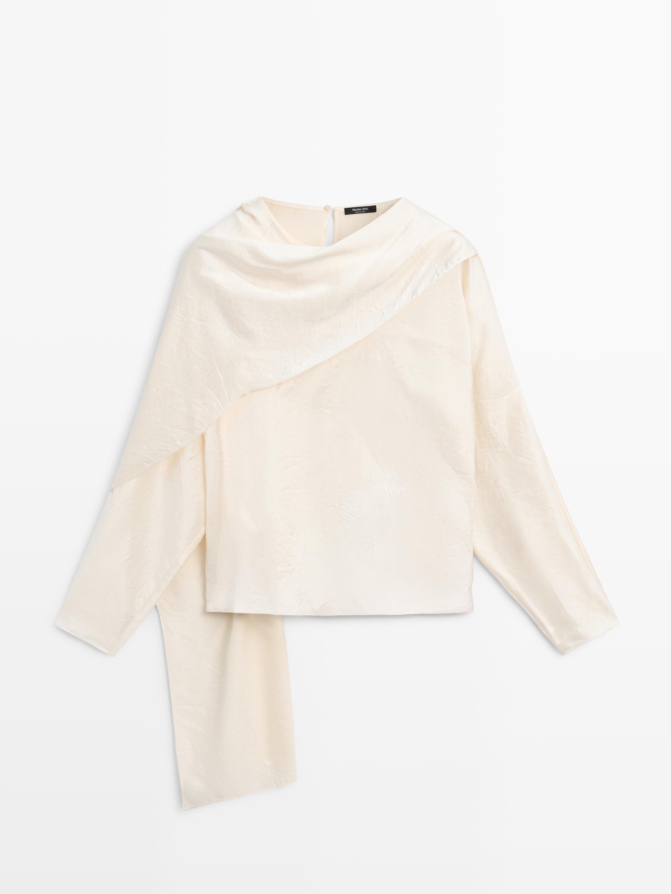 Flowing blouse with satin finish fabric. High crew neck. Long sleeves. Back button fastening and teardrop opening. Scarf detail at the neck .