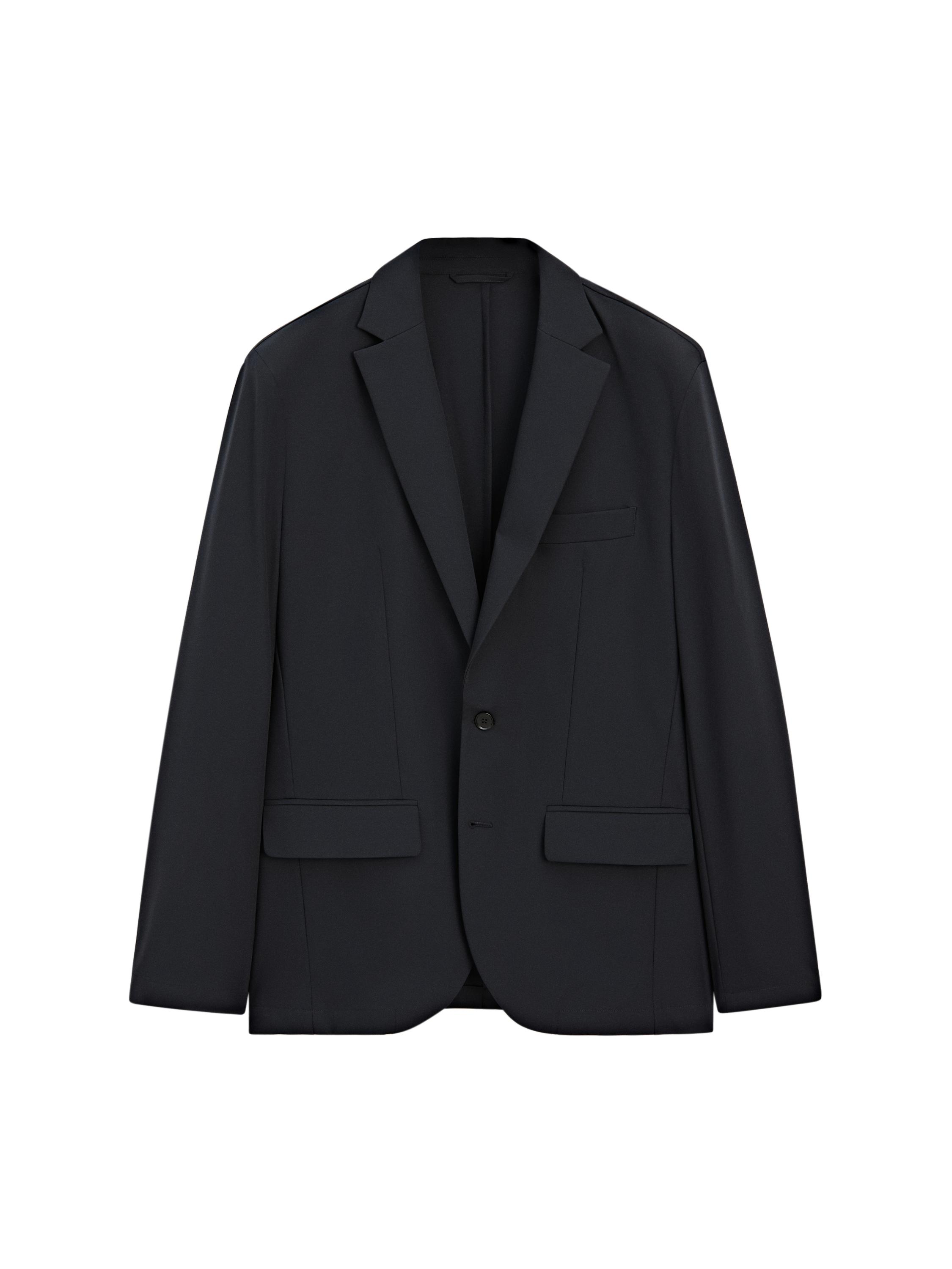 Veste en tissu technique léger . Col à revers cranté. Manches longues. Fermeture à deux boutons. Deux poches à rabat. Une poche poitrine insérée. Une poche intérieure. Split au milieu du dos.