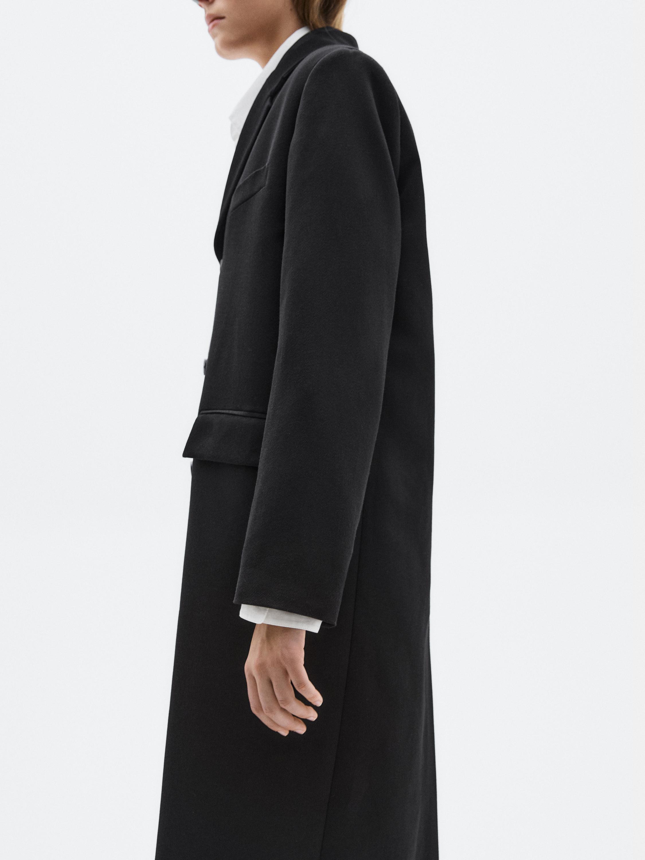 Long coat made of 100% wool fabric. Lapel collar. Long sleeves. Three-button fastening. Two flap pockets. Insert welt pocket at the chest. An inside pocket. Central back opening. Lined.
