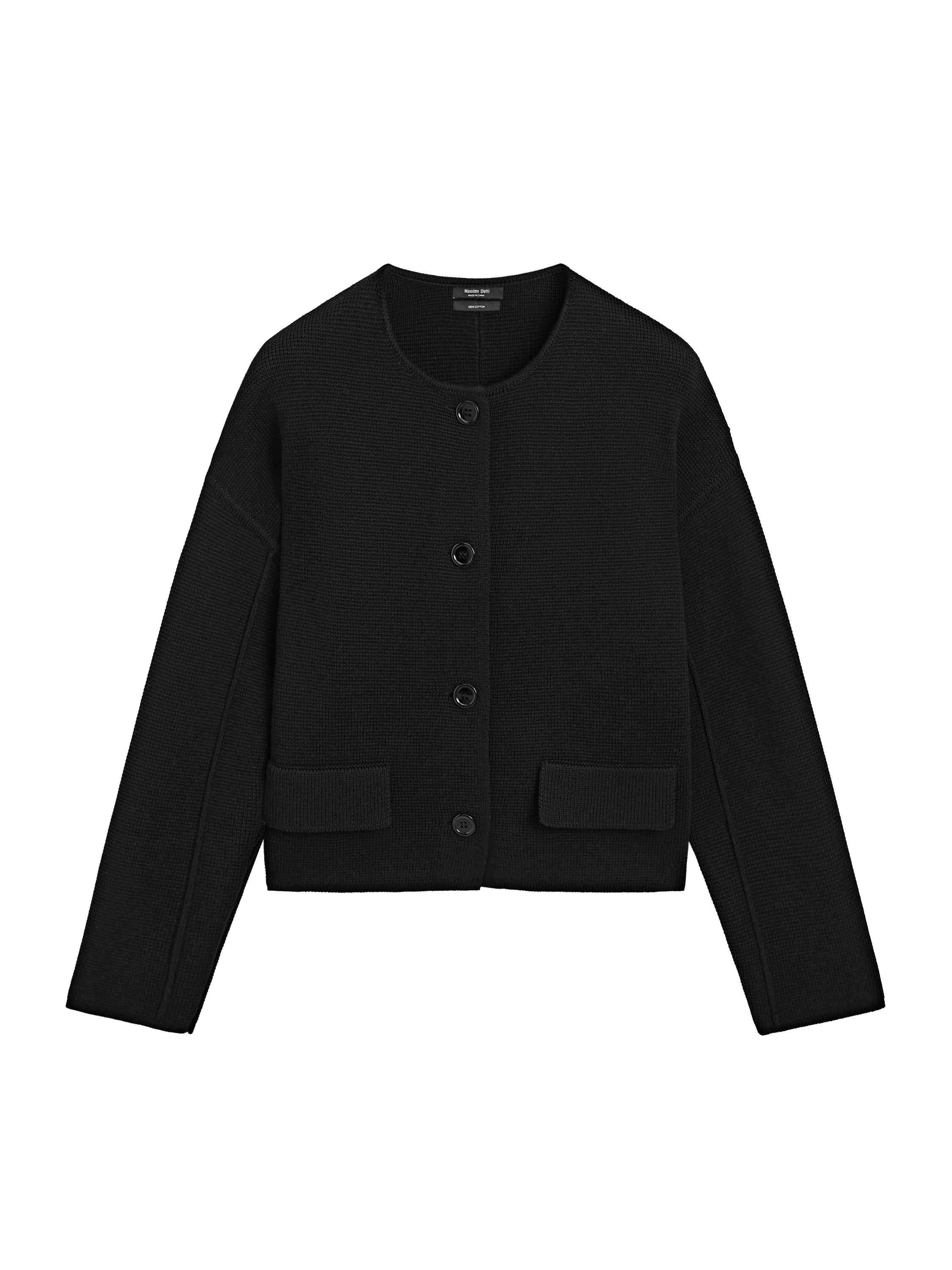 Cardigan made of knitted fabric with cotton. ياقة دائرية دون طوق. أكمام طويلة. زر علوي أمامي. جيوب على الجانبين. بملمس بارز.