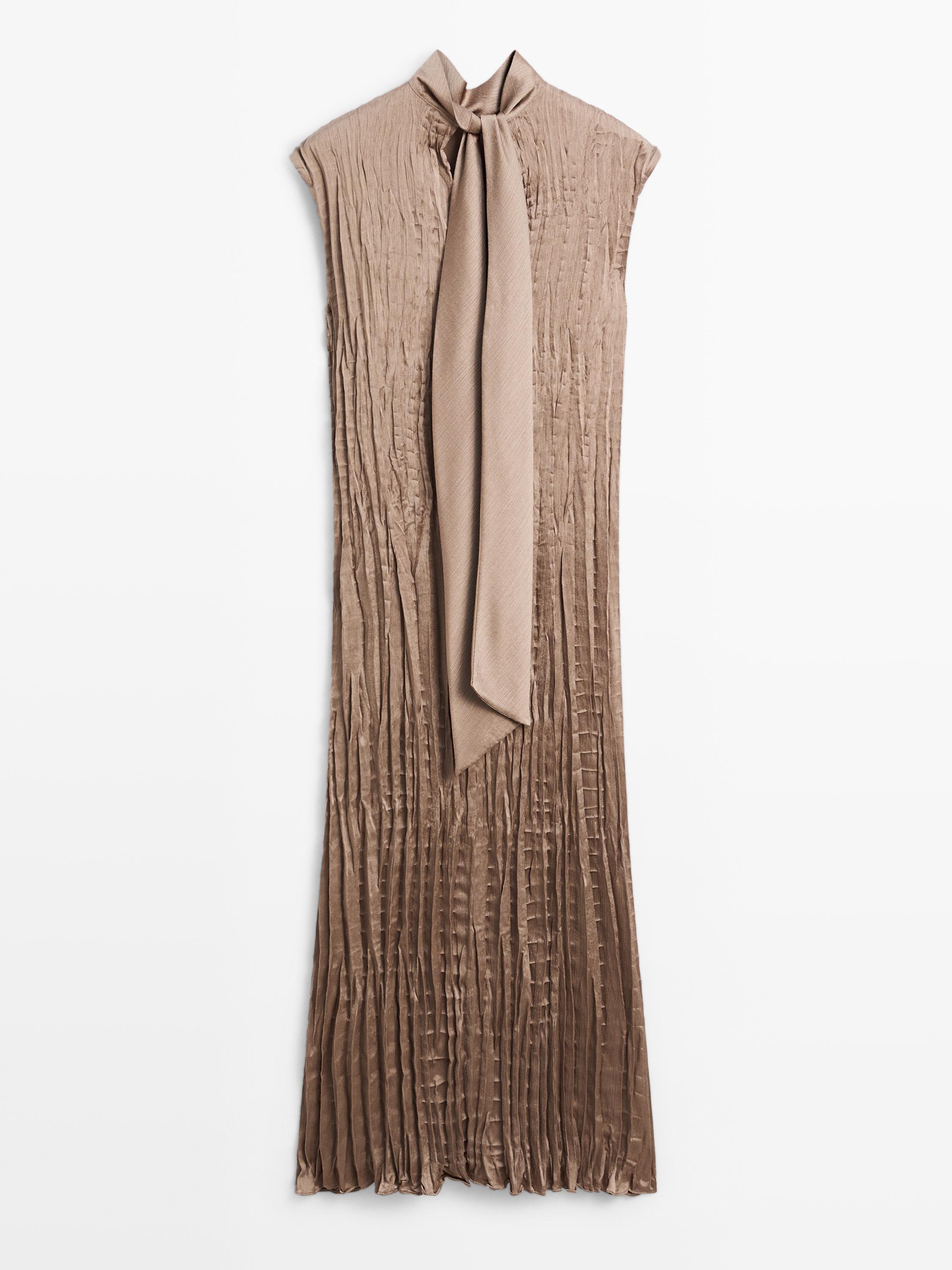فستان طويل بمظهر بليسيه. دون أكمام. ياقة بربطة .