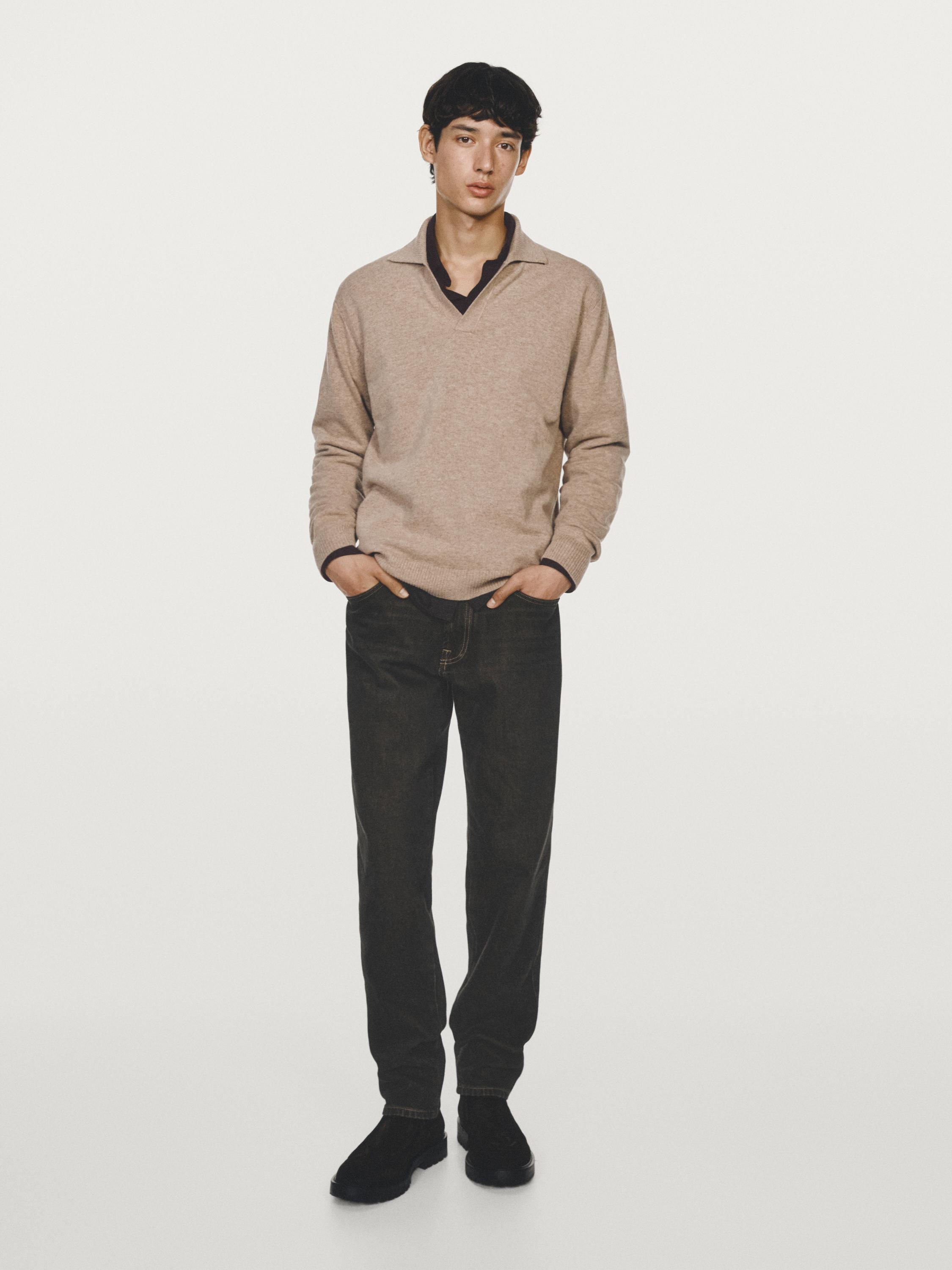Pull en maille 100 % laine . Col en V type polo. Manches longues. Finitions côtelées .