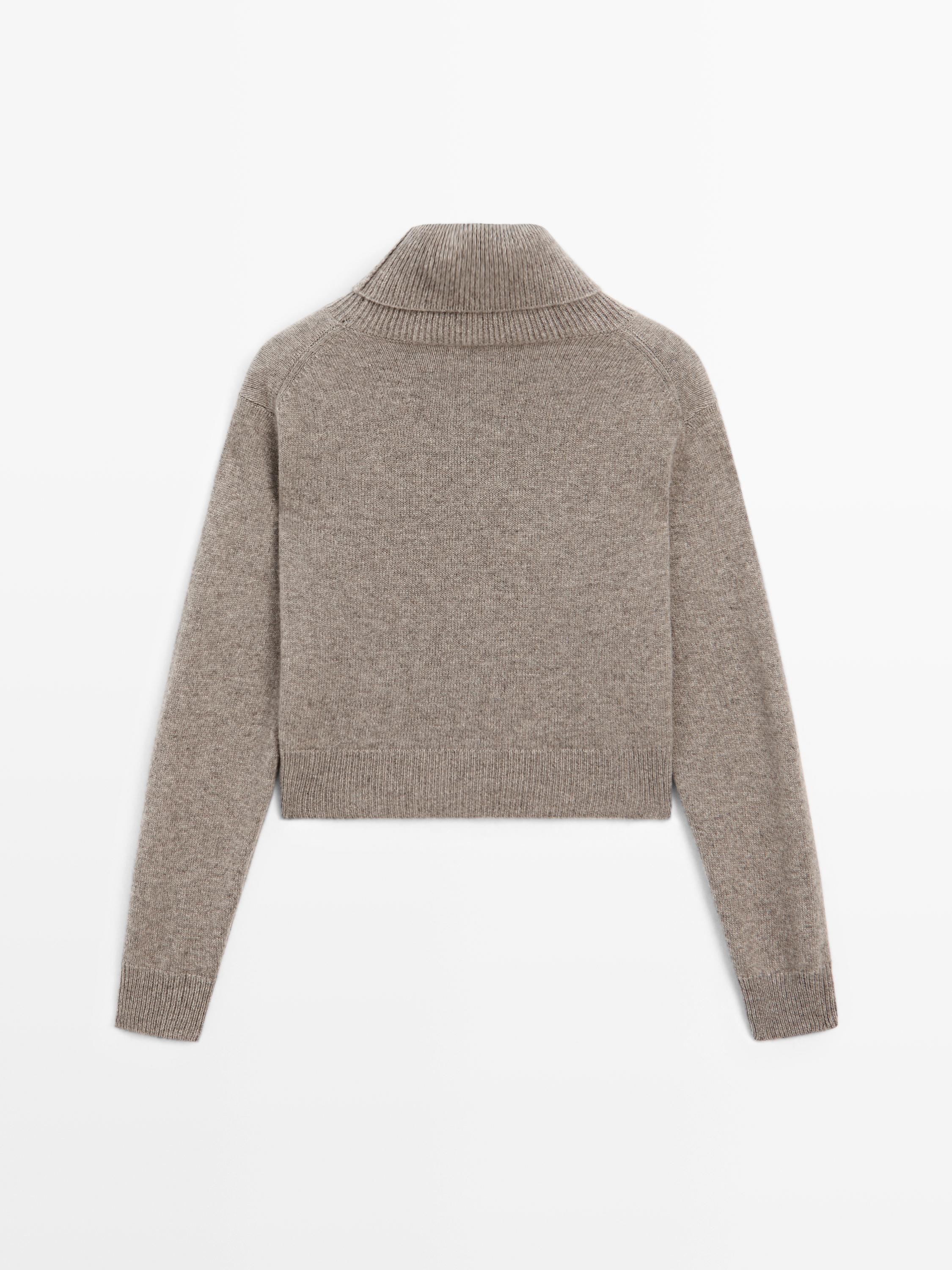 Плетен џемпер изработен од 100% кашмирска ткаенина. Висока јака. Долги ракави. Ребрести рабови .