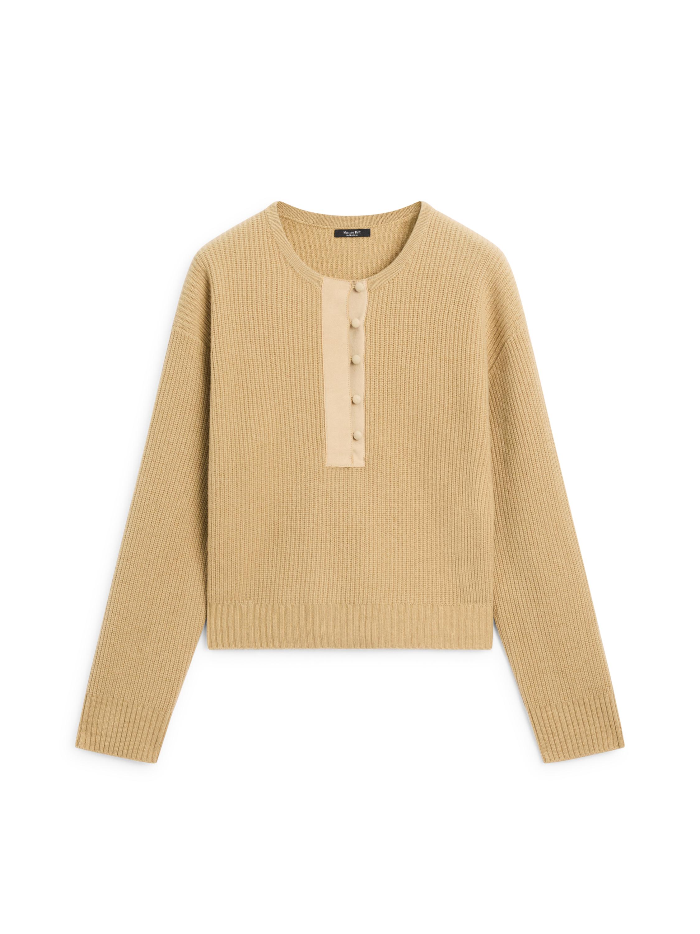 Pulovër e thurur në pëlhurë prej përzierjeje leshi . Jakë me perçina. Jakë rrethore. Bordurë me damarë të hollë .