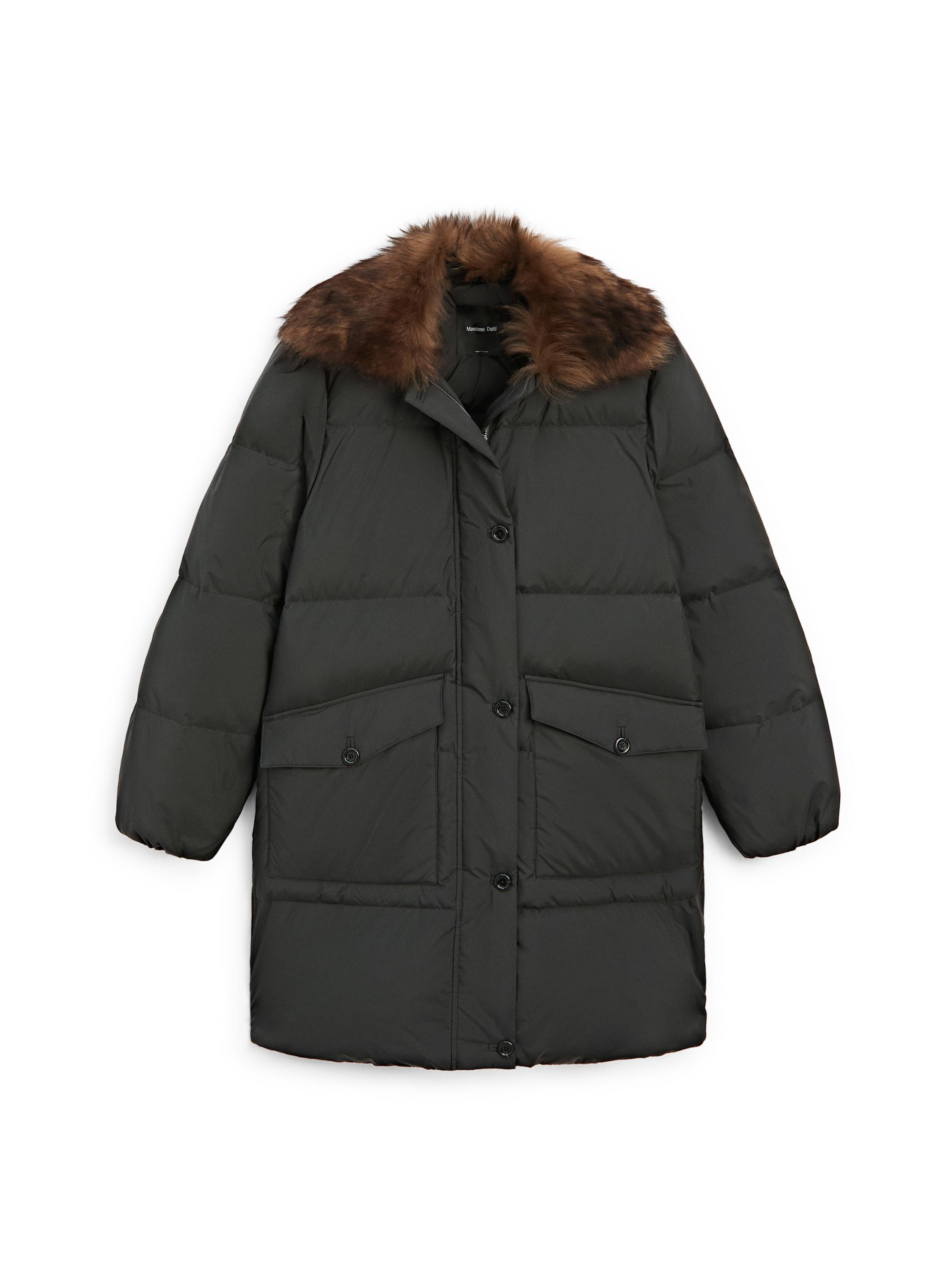 Xhupa me mbushje me pupla dhe pendë. Jakë këmishe. Mbyllje me zinxhir të fshehur me susta. Detachable collar with fur. Dy xhepa me kapak me kopsë. Pëlhurë kundër ujit.