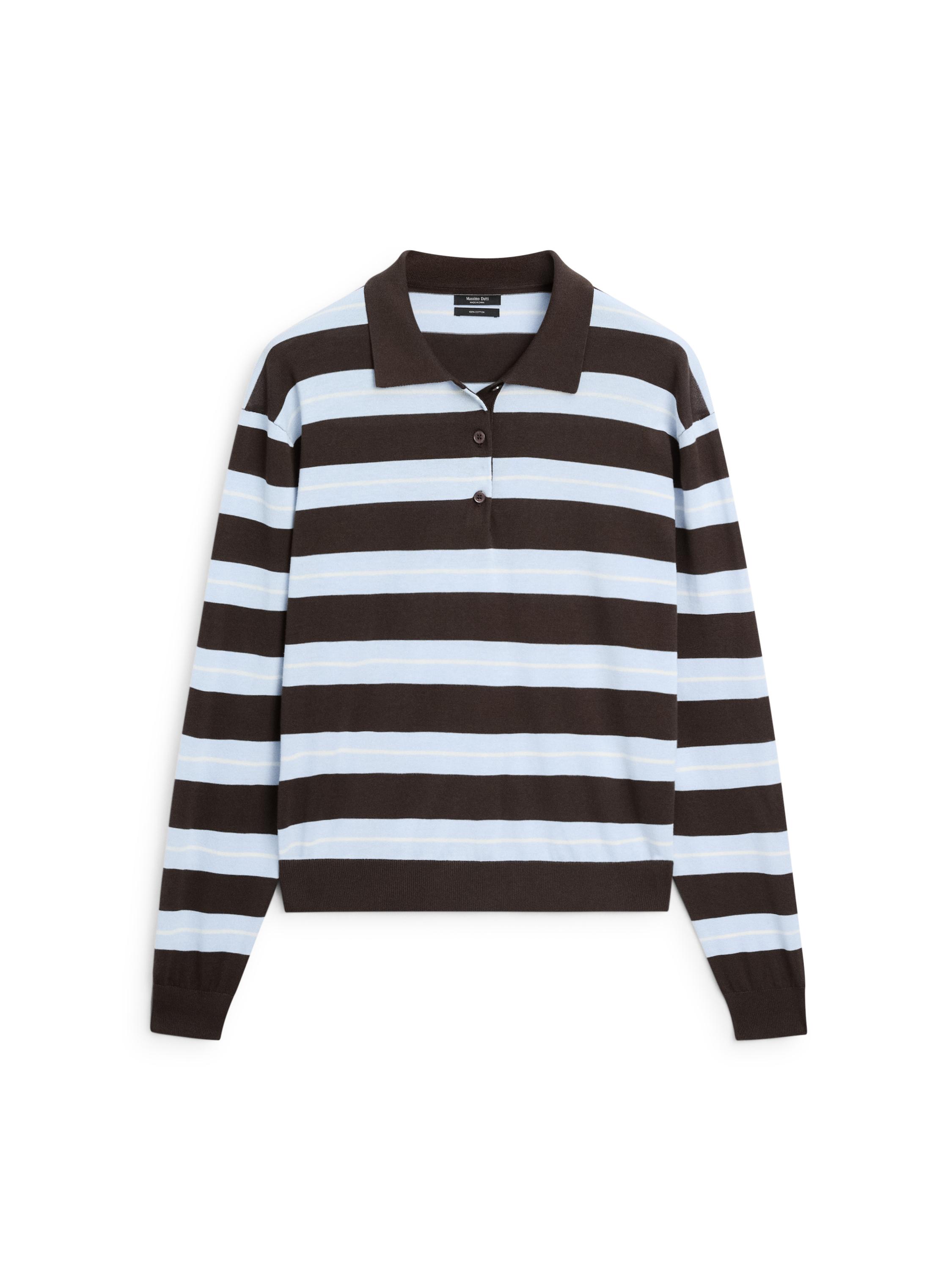Knit jumper made of cotton fabric. Long sleeves. Polo collar with button fastening. Striped print.