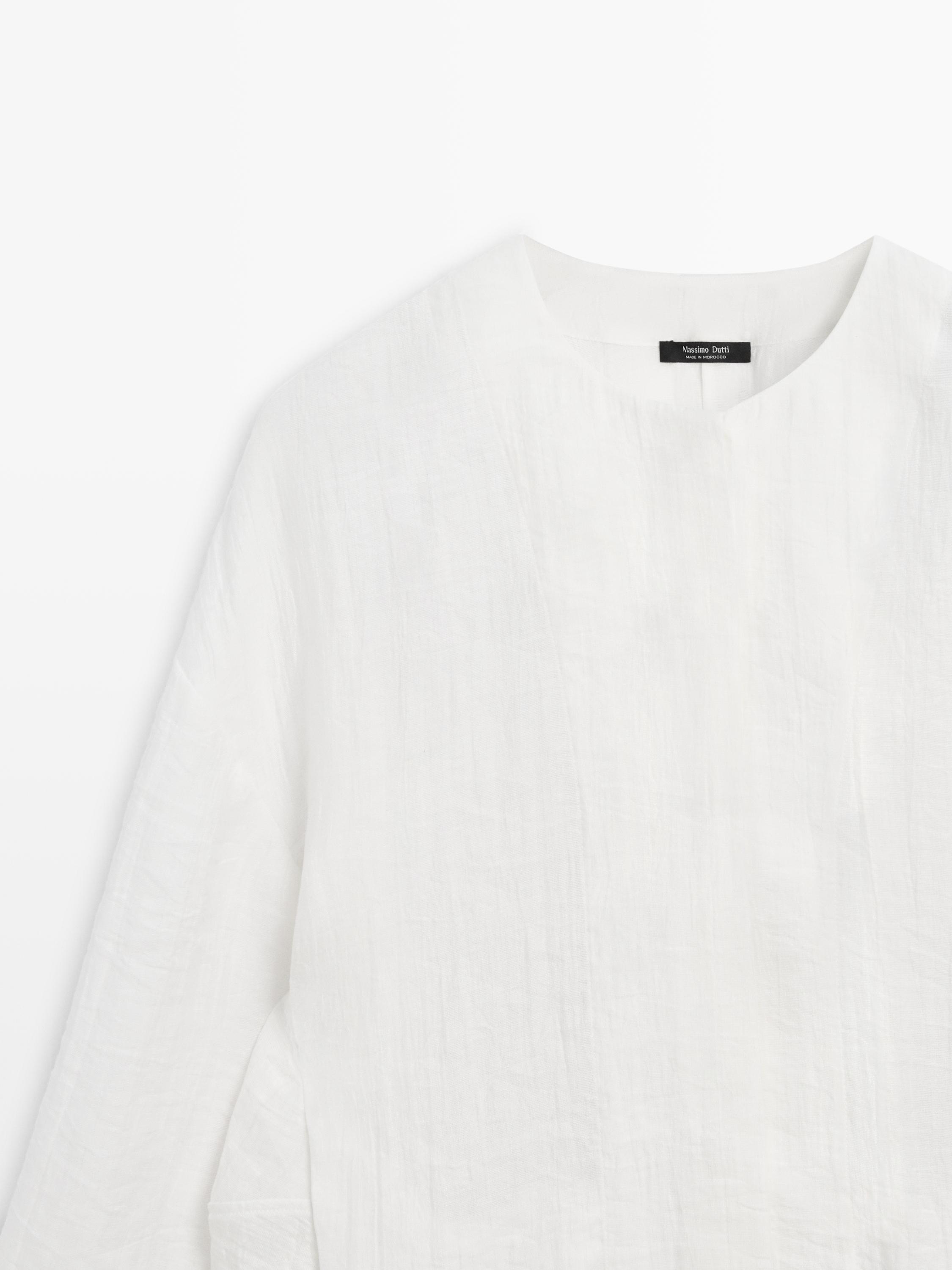 Camisa estilo bomber fluida. Cuello redondo. Manga larga ancha. Cierre mediante botones. Dispone de prenda a conjunto.