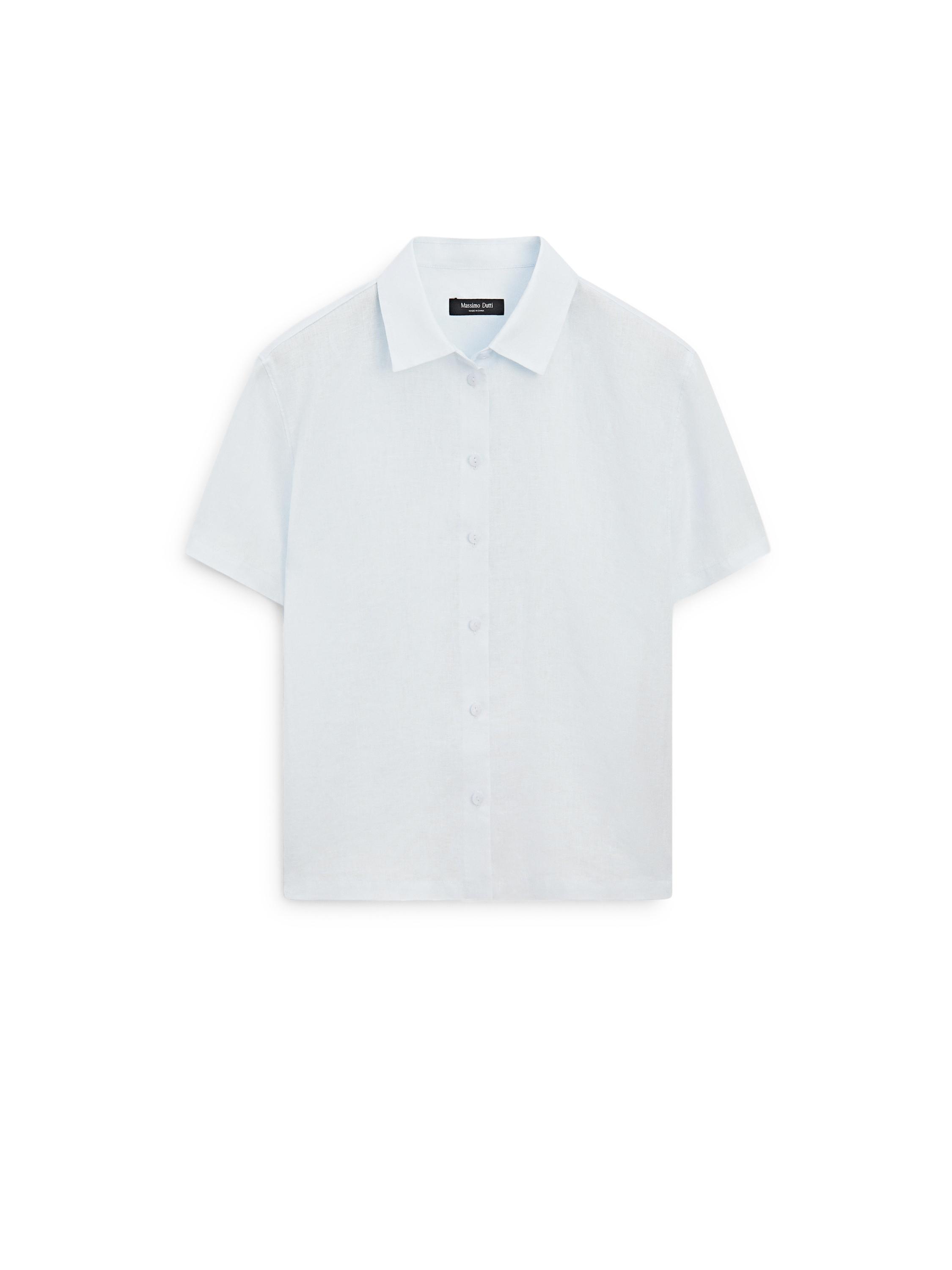 Camisa confeccionada en tejido 100% lino. Cuello camisero. Manga corta. Cierre mediante doble botonadura frontal.