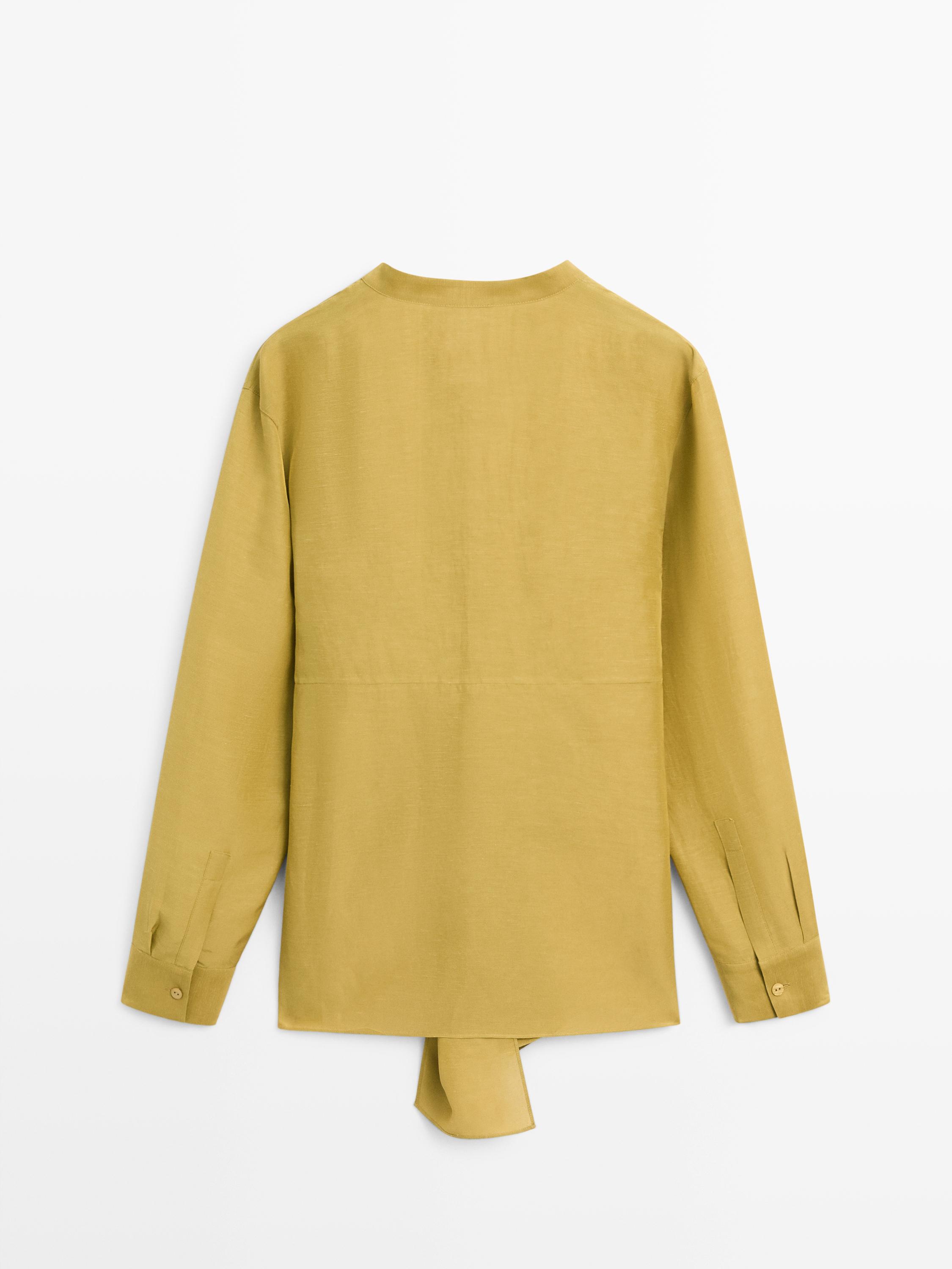 Camisa fluida confeccionada con lino. Manga larga con puño abotonado. Cuello pico. Cierre mediante botonadura frontal. Parte posterior más larga que la delantera. Detalle nudo.
