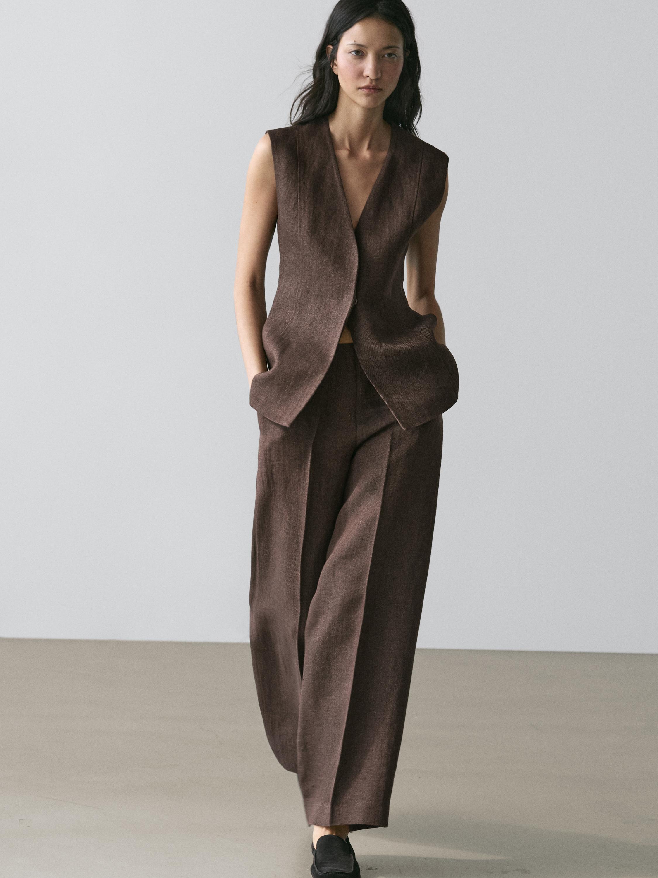 Chaleco confeccionado en tejido 100% lino. Escote en forma de pico . Sin mangas. Cierre por un botón. Esta prenda forma parte de un traje.