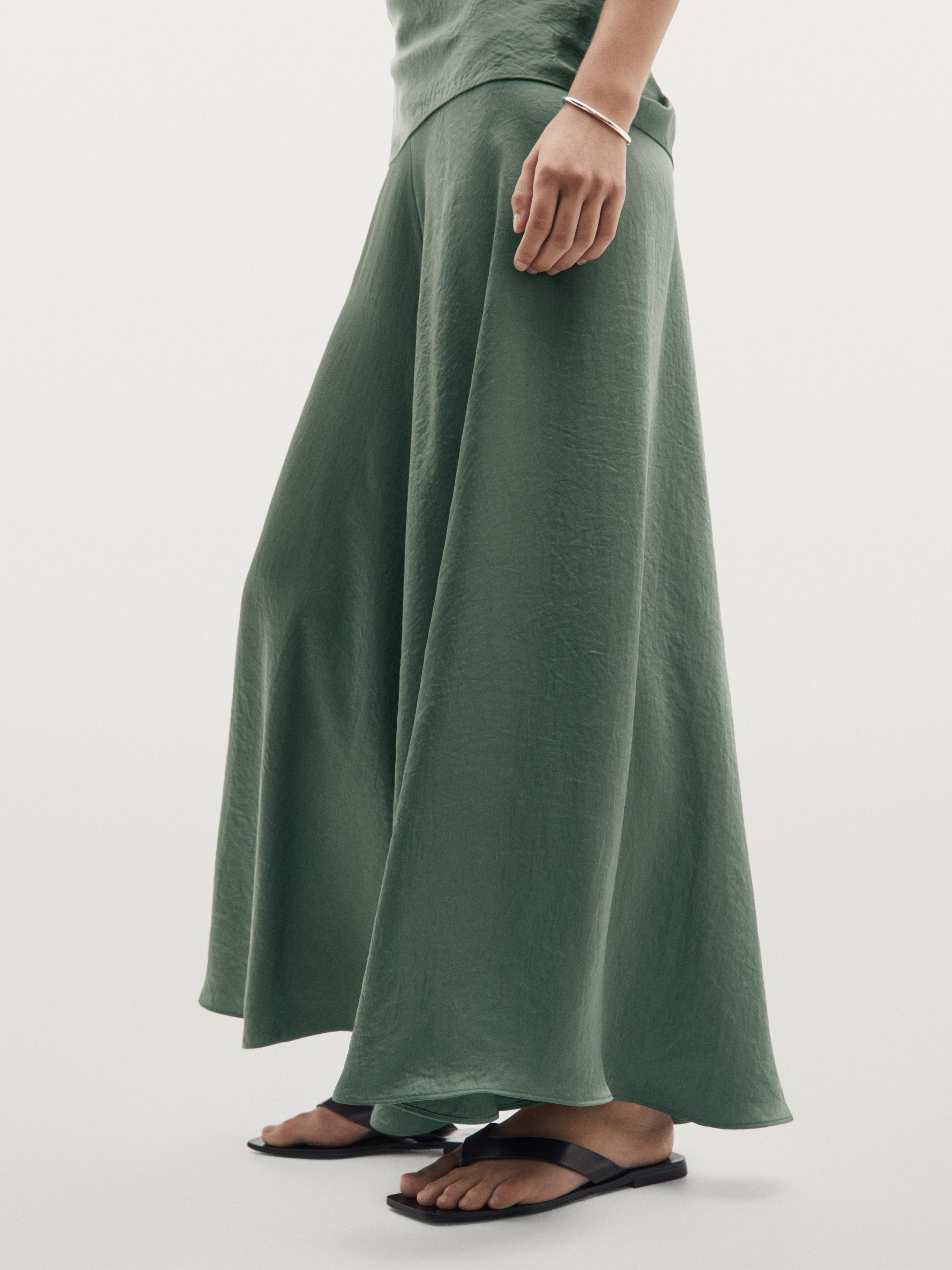Pantalón ancho con tejido fluido. Satin finish. Cierre mediante cremallera en la parte posterior.