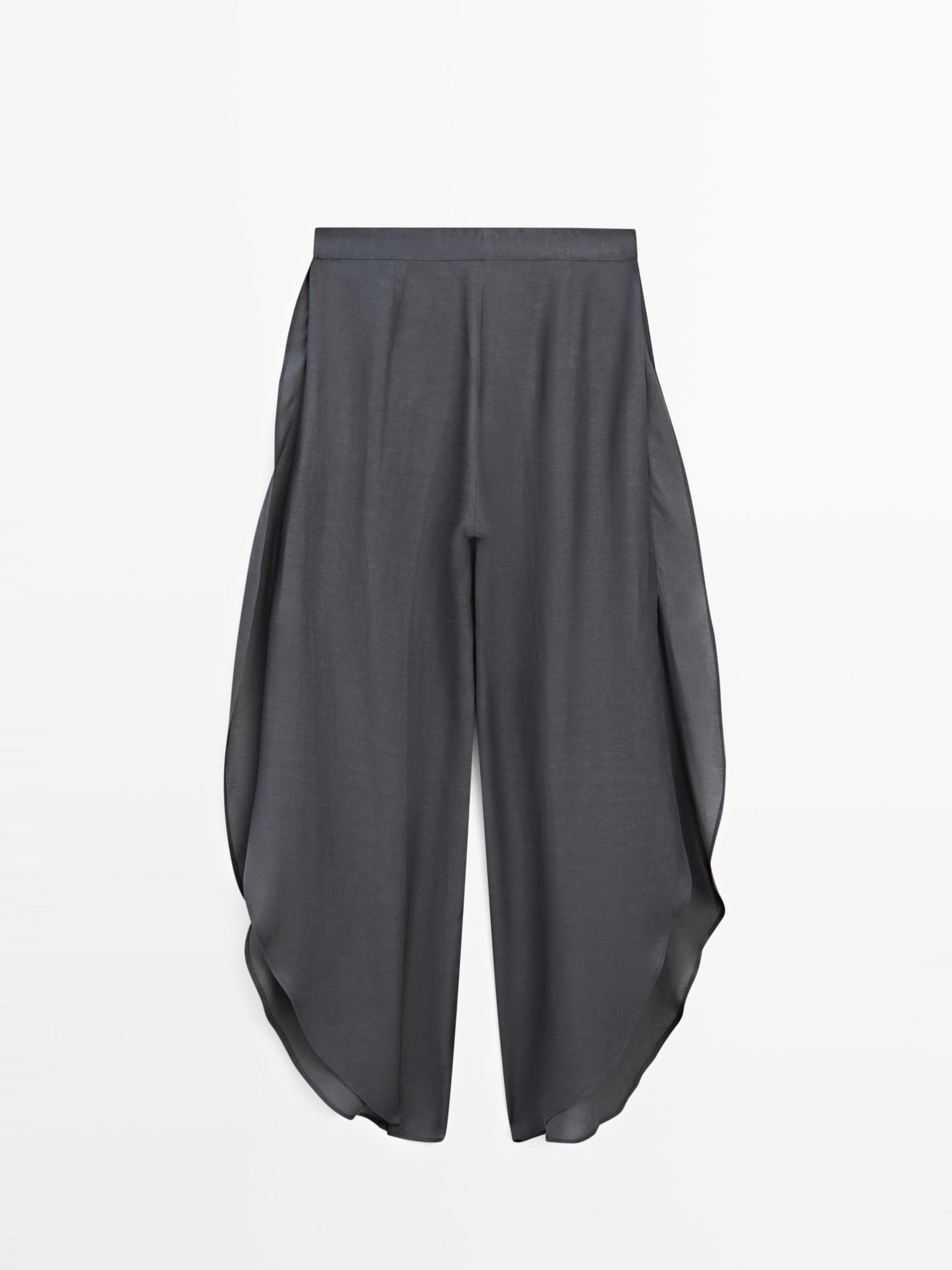 empty Trousers made with linen fabric. Cintura con trabillas . Dos bolsillos laterales. Aberturas laterales. Cierre con cremallera y botón oculto.