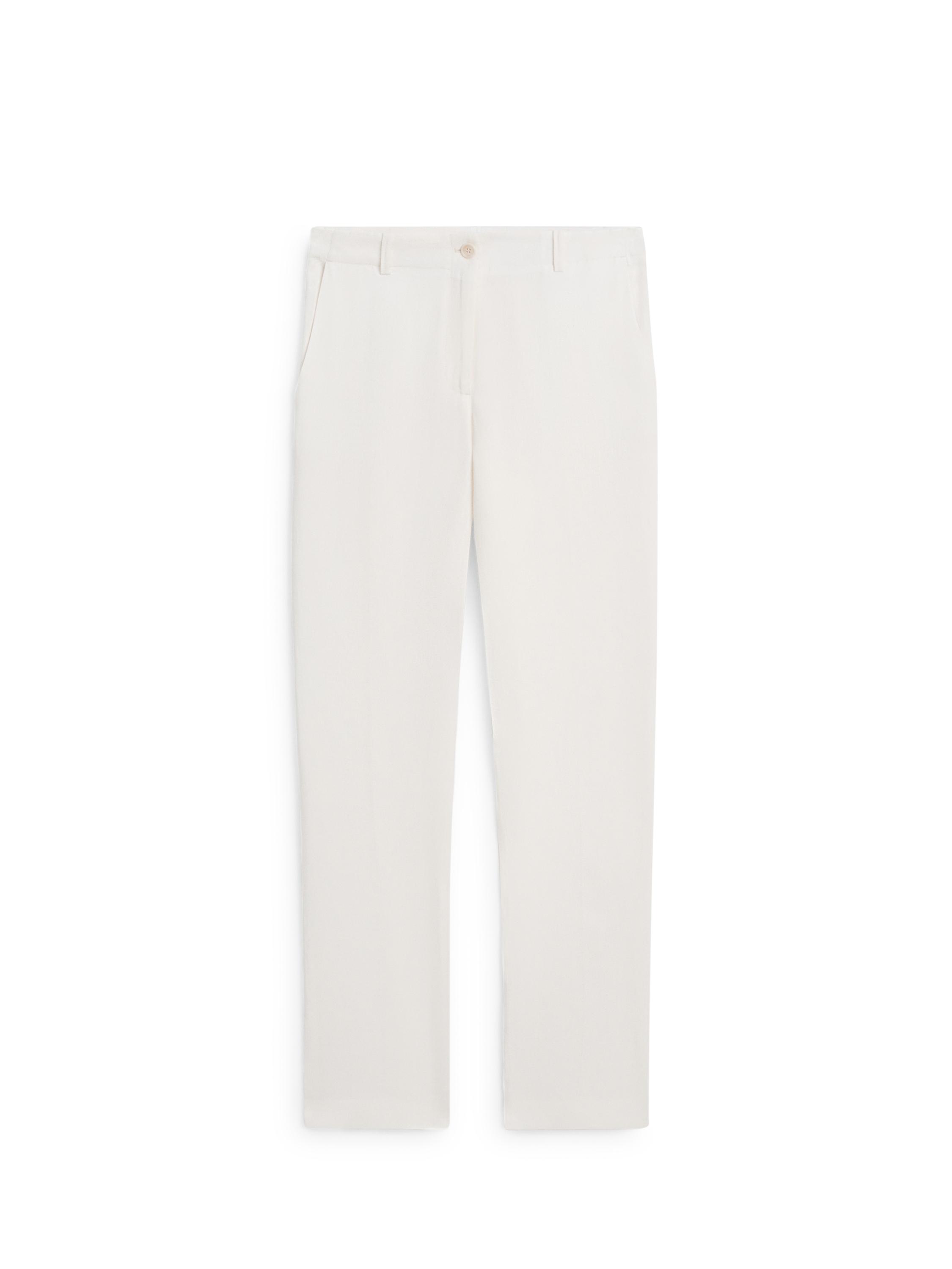 Pantalón de traje confeccionado en tejido principal lino. Cintura con trabillas . Cierre frontal por cremallera y botón. Dos bolsillos laterales. Un bolsillo de ojal en la parte posterior.