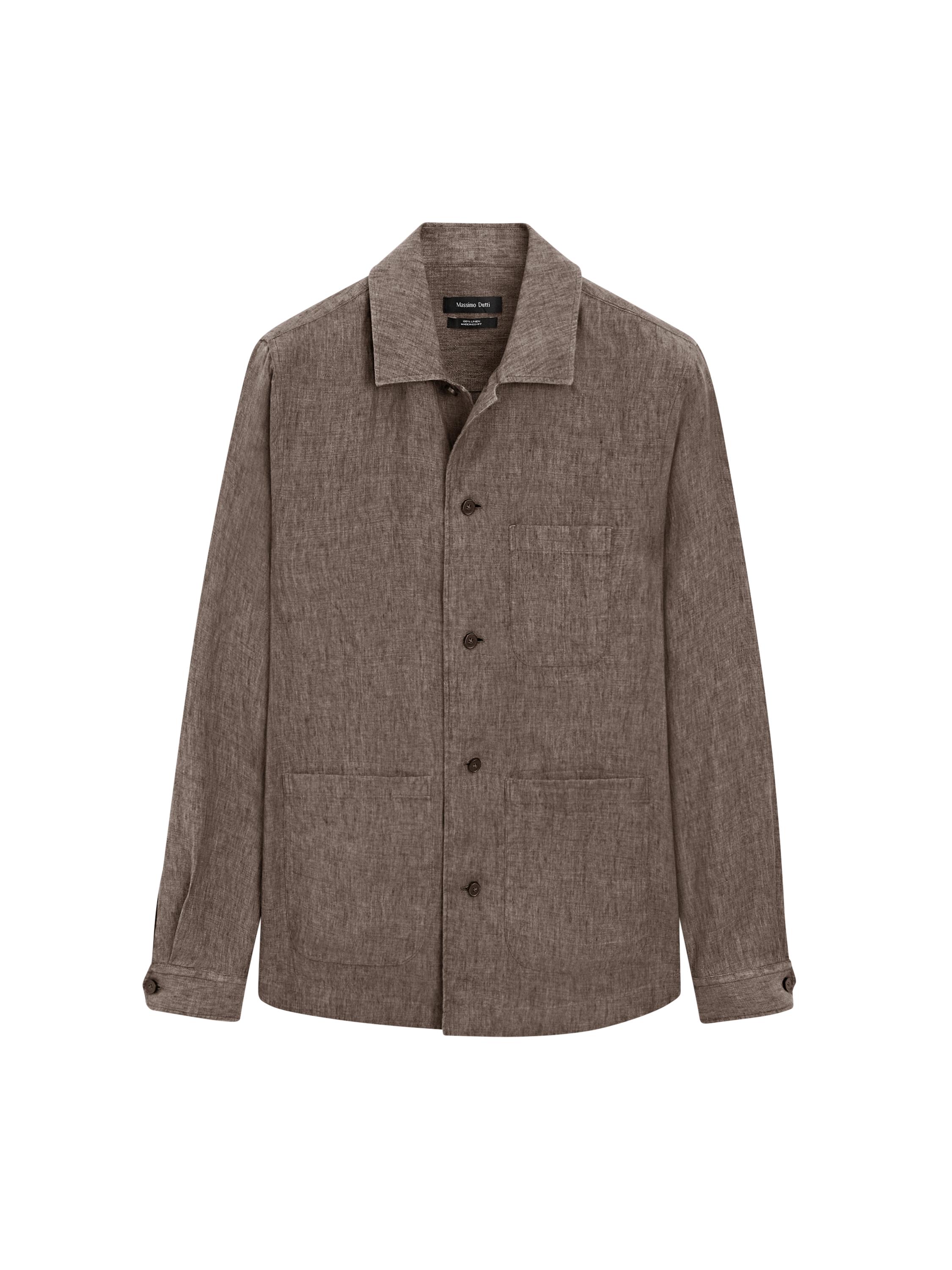 Sobrecamisa confeccionada con tejido lino. Manga larga con puño abotonado. Cuello camisero. Cierre mediante botonadura frontal. Tres bolsillos de parche.