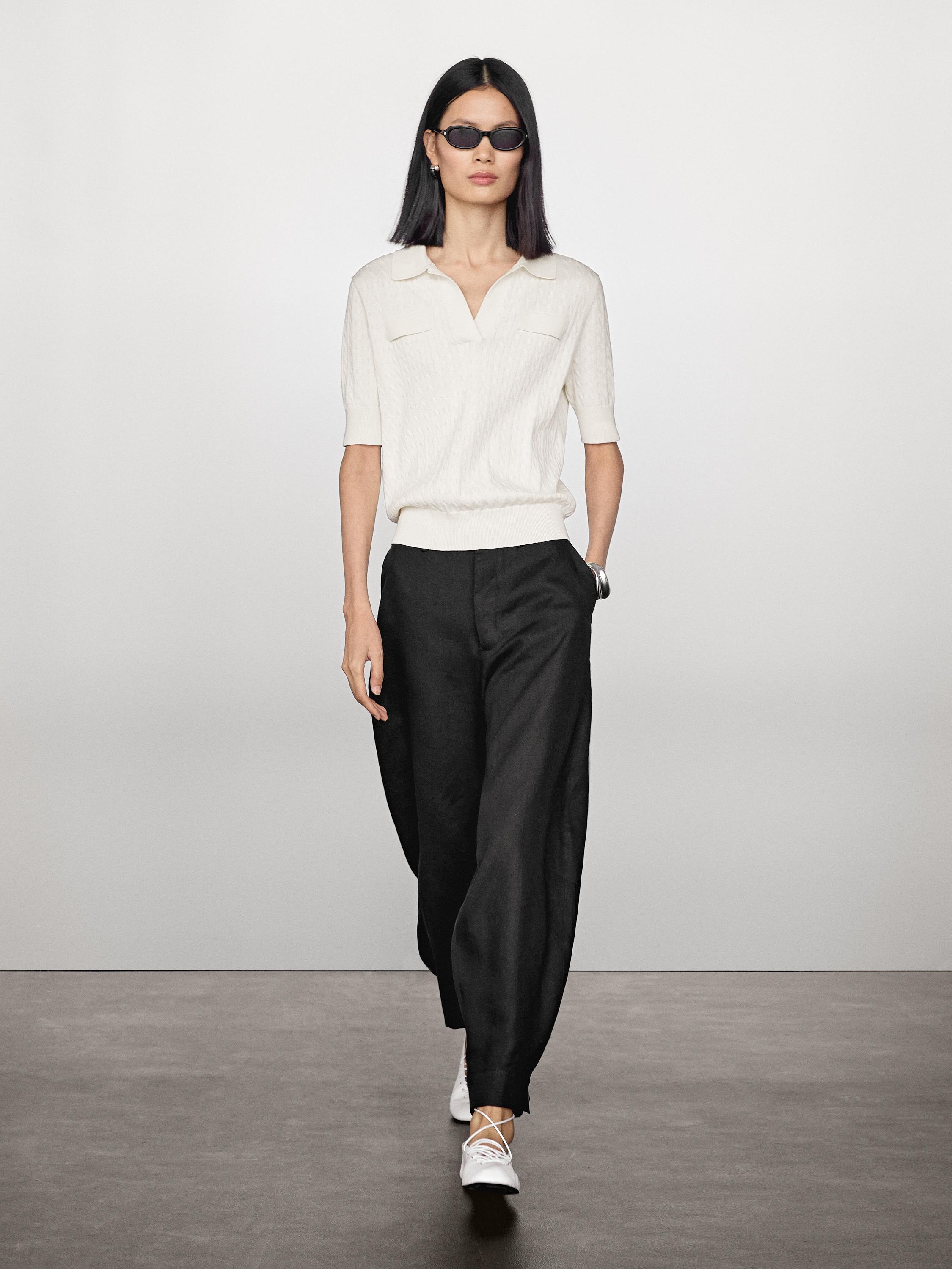 Knit jumper made of 100% cotton fabric . Johnny collar. Short sleeves. Braided detail.