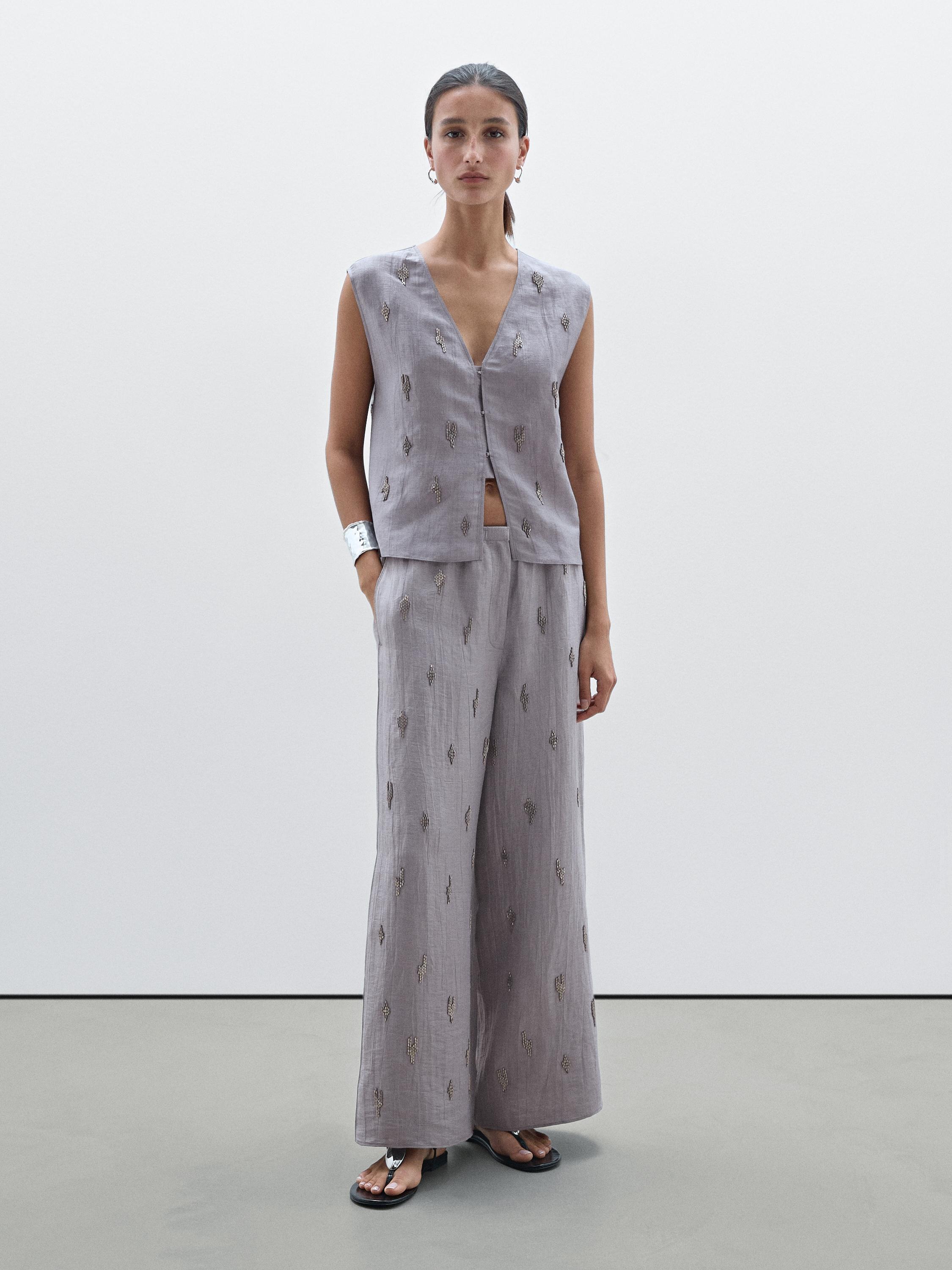 Top made of a linen blend. V-neck . Sleeveless. Beadwork detail. Hook fastening . Matching garment available.