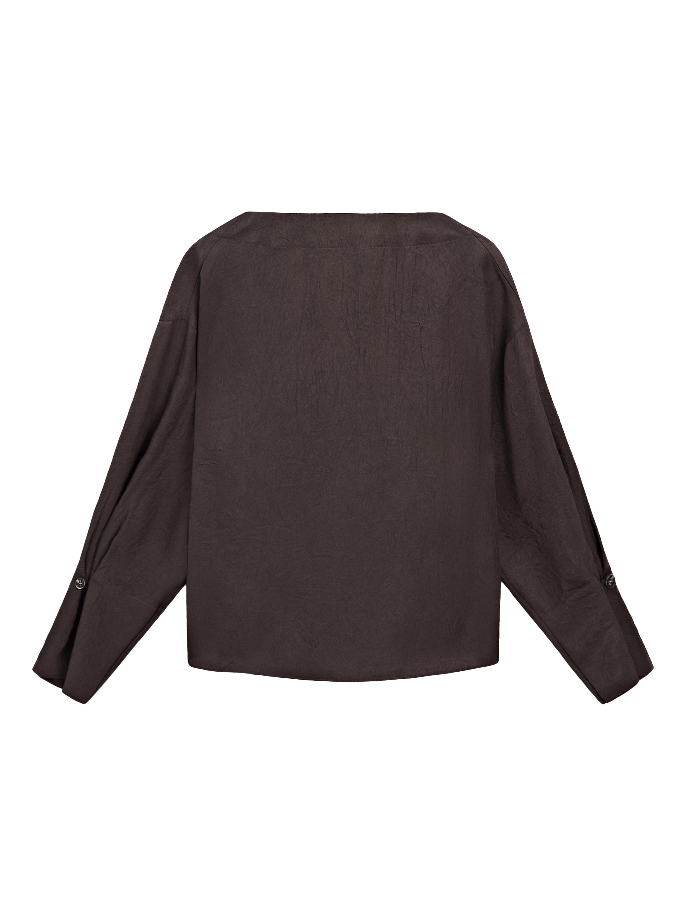 Flowing blouse with satin finish fabric. Long sleeves with buttoned cuffs. Boat neck. V-neck back. Button fastening at the back. Matching garment available.
