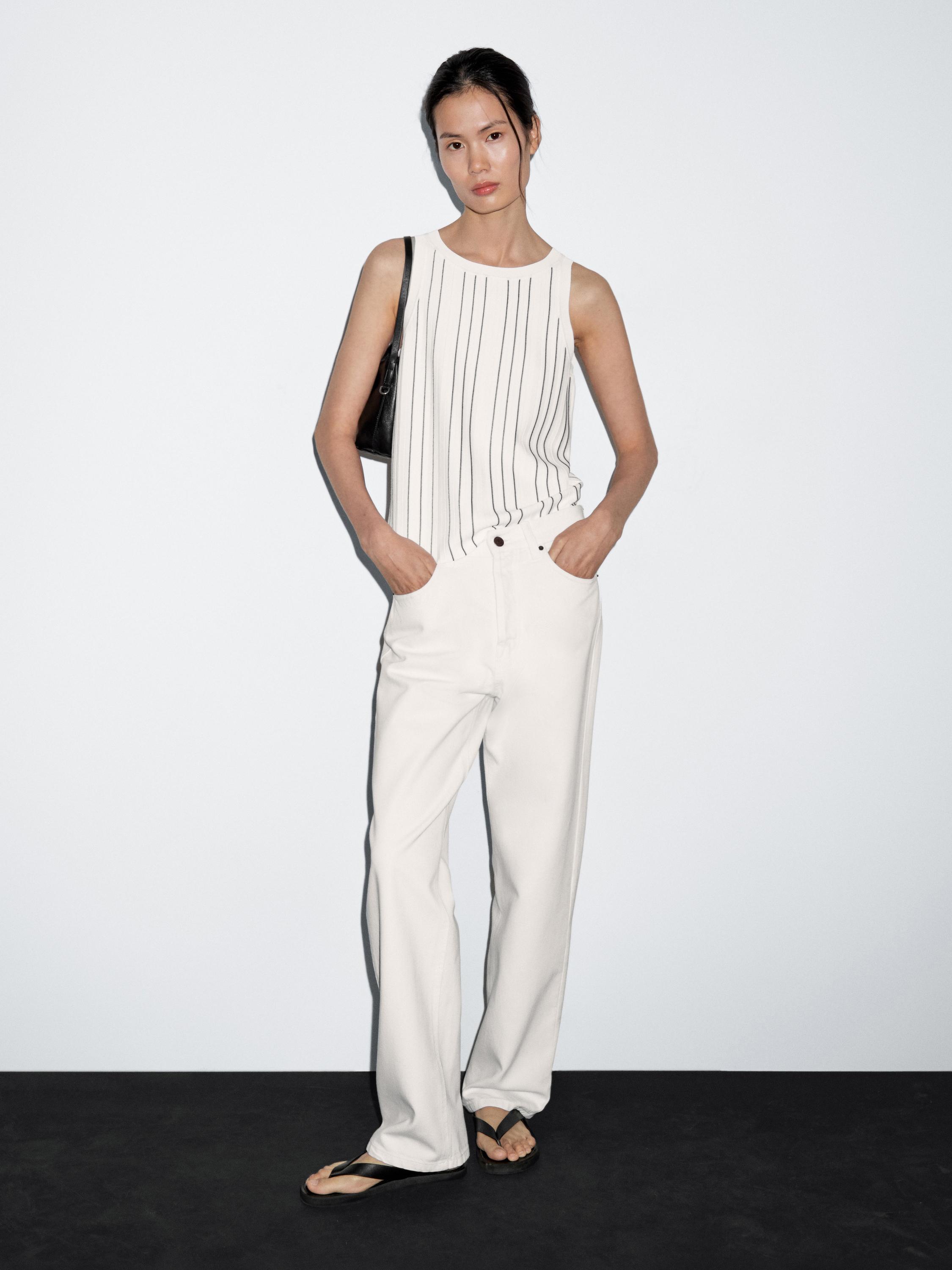 Top made of knit fabric. Crew neck. Sleeveless. Ribbed trims . Striped detail.