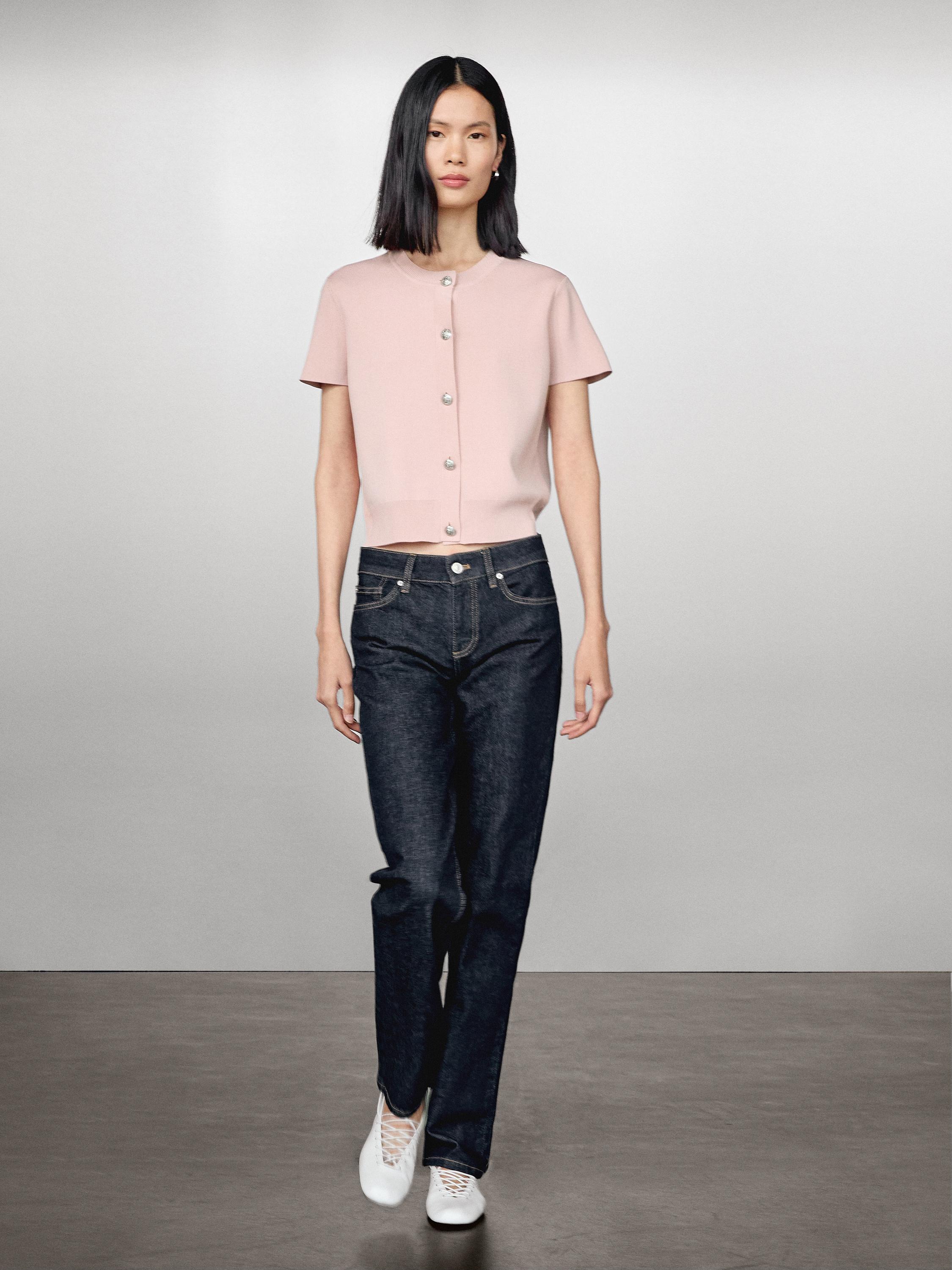 Knit cardigan in fine, lightweight fabric . Crew neck. Short sleeves. Elegant silver-toned rhinestone buttons.