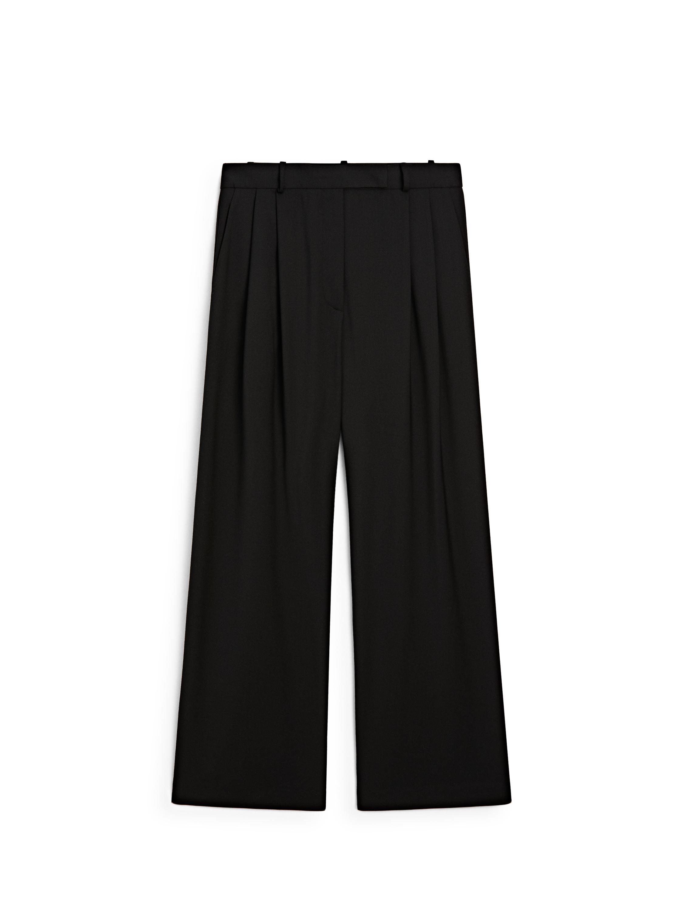 Broek vervaardigd van een wolmix. Tailleband met ceintuurlussen . Verborgen ritssluiting, riempje met knoop, haakjessluiting en knoop aan de binnenkant. Twee steekzakken. Plooi aan de voorzijde.