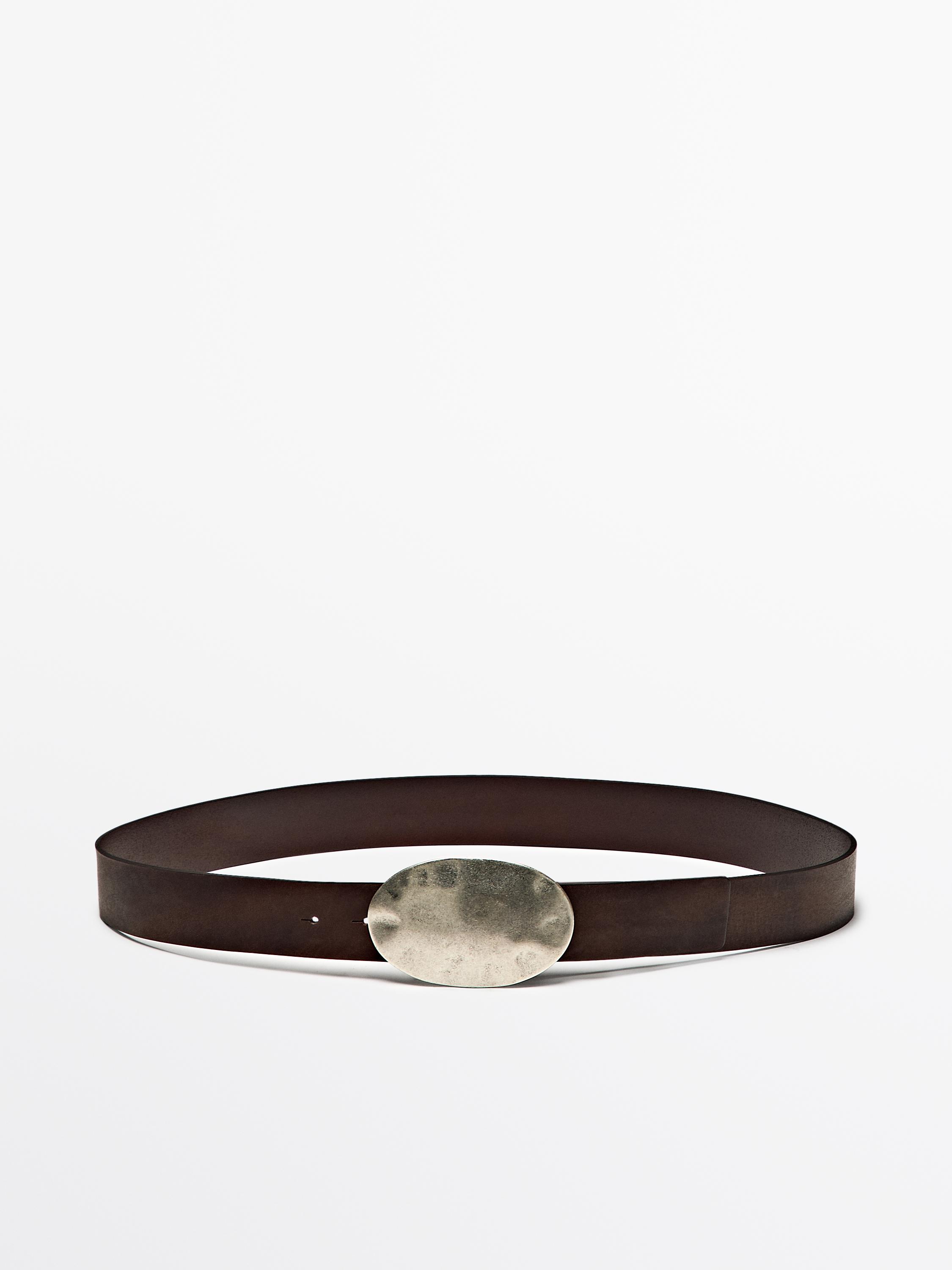 Belte i okseskinn med en nappa-finish. Oval metallspenne med uregelmessig struktur .