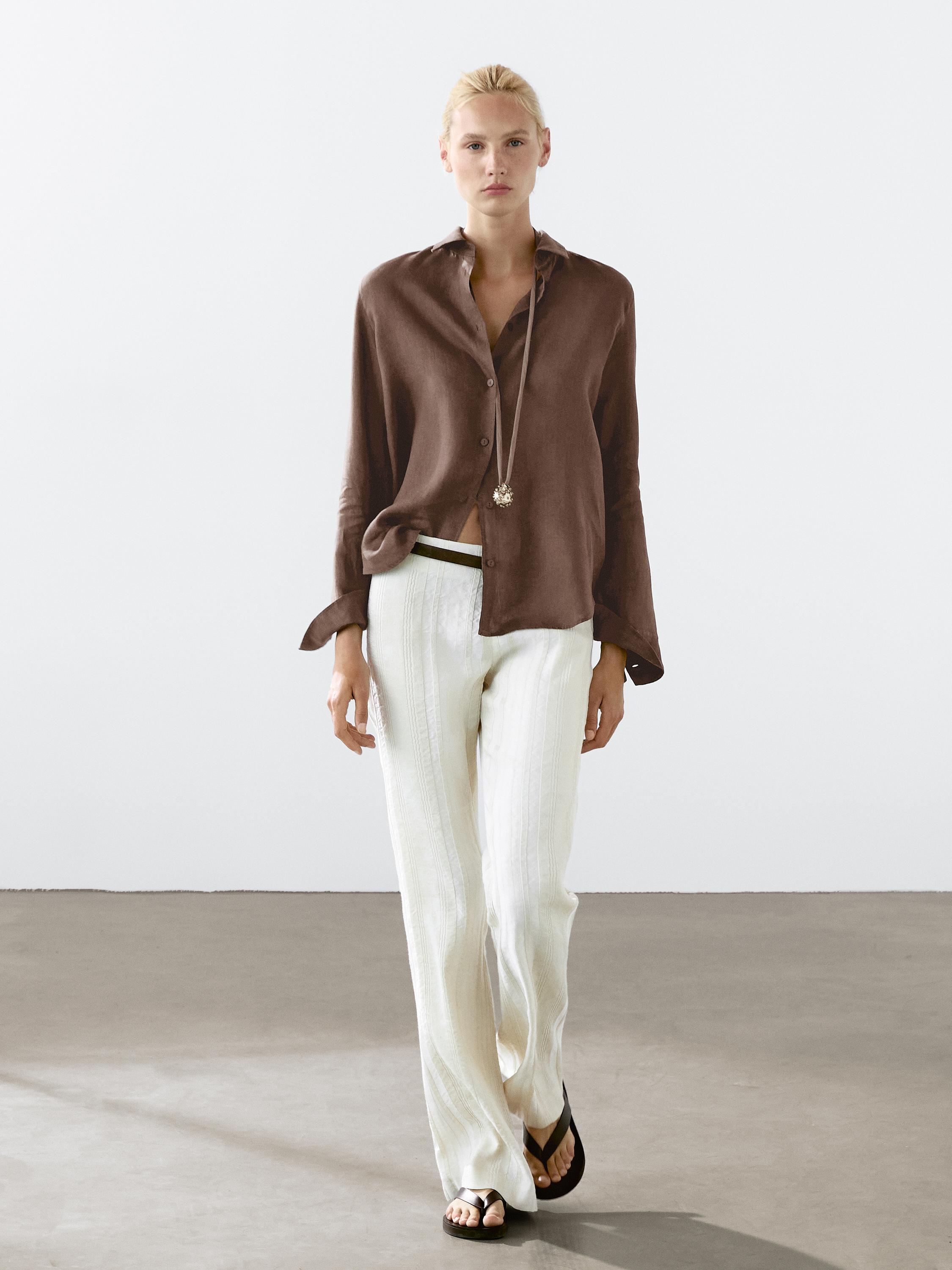 Camisa confeccionada en tejido 100% lino. Manga larga con puño abotonado. Cuello camisero. Cierre mediante botonadura frontal. Tejido fino y ligero. Silueta amplia y relajada, sin ajuste al cuerpo.