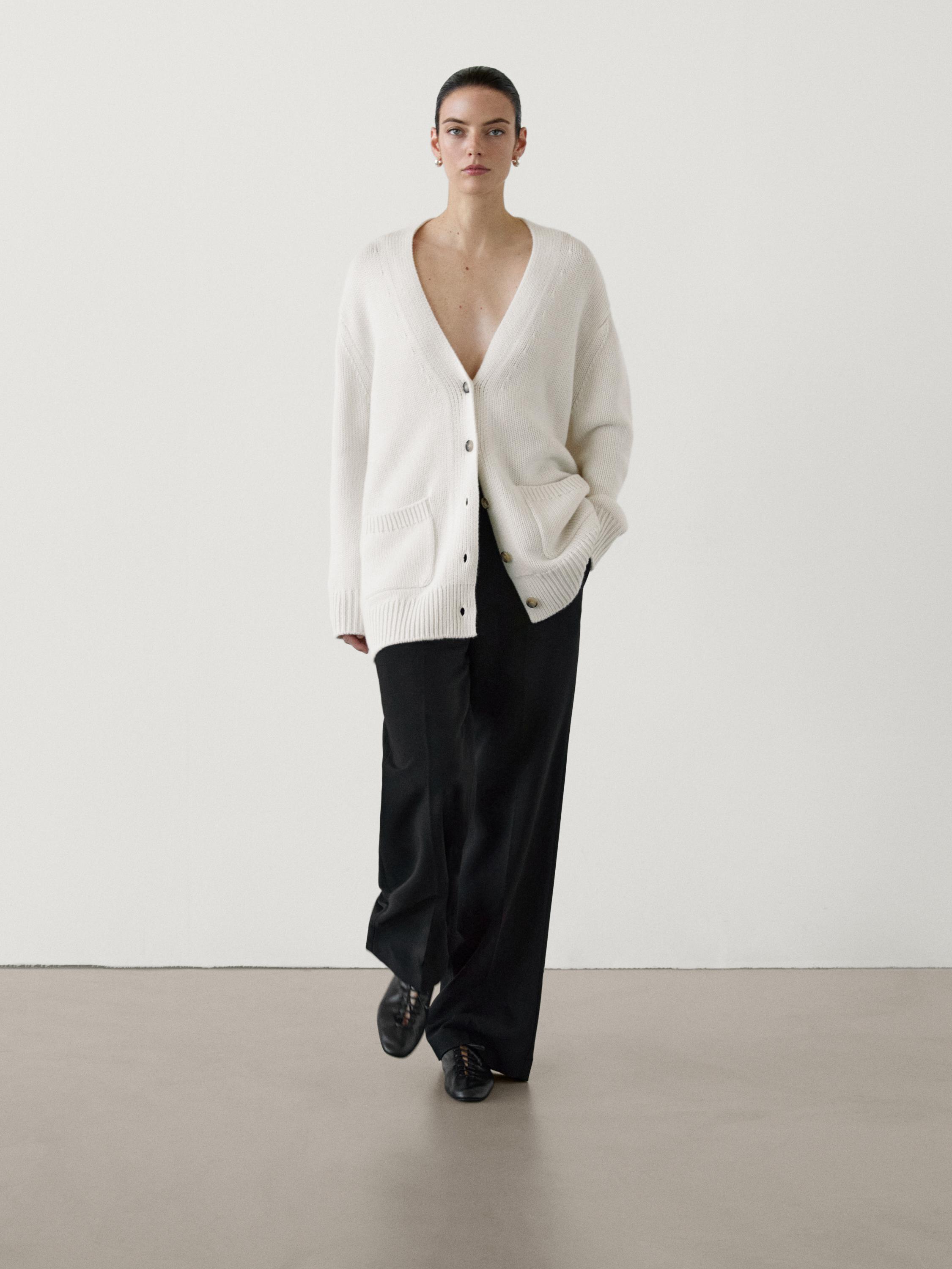 Cárdigan de punto confeccionado en 100% cashmere. Escote en forma de pico. Cierre mediante botonadura frontal. Dos bolsillos de parche. Acabados acanalados. Detalle de hombro caído.
