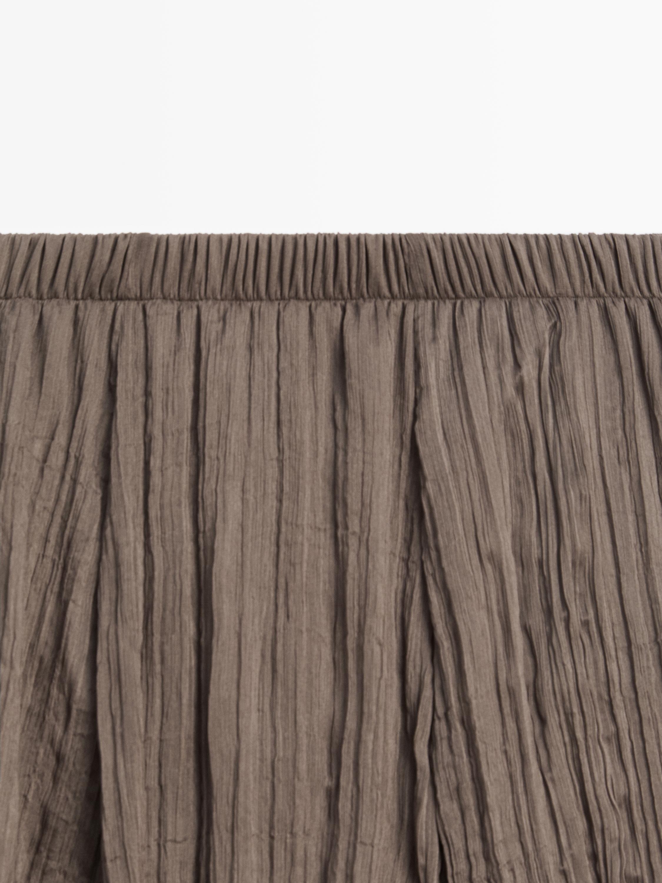 Falda plisada corte midi. Cintura con goma elástica. Detalle de acabado asimétrico .