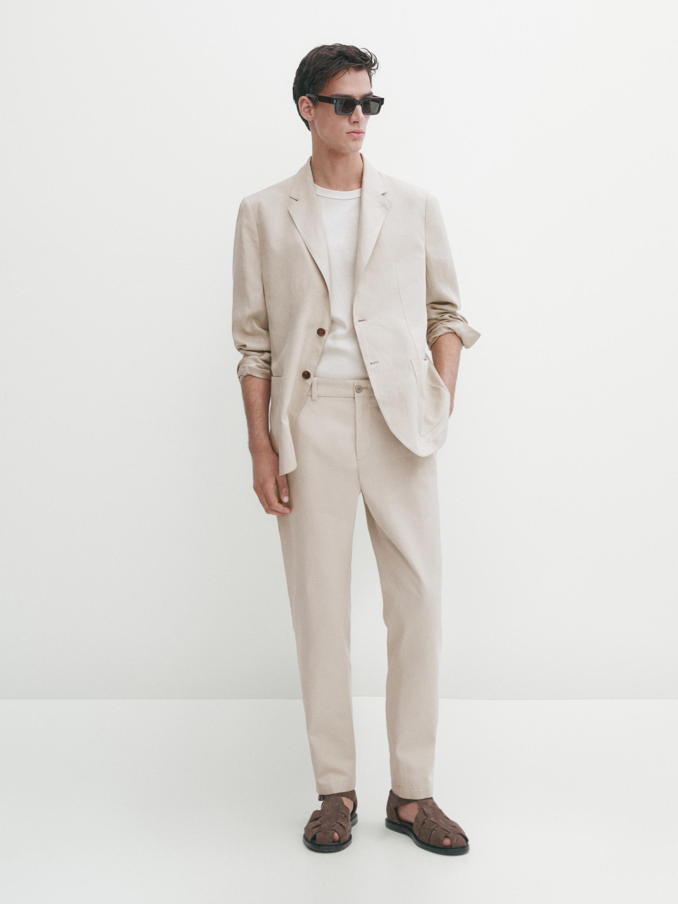 Pantalón Slim fit: este fit presenta una silueta ligeramente ajustada al cuerpo, ceñida en la cintura y las piernas. Cintura con trabillas . Dos bolsillos de plastrón en la parte posterior. Cierre frontal por cremallera y botón. Dos bolsillos laterales. Confeccionado en tejido con lino. Confeccionado con tejido en mezcla de algodón. Silueta amplia y relajada, sin ajuste al cuerpo.