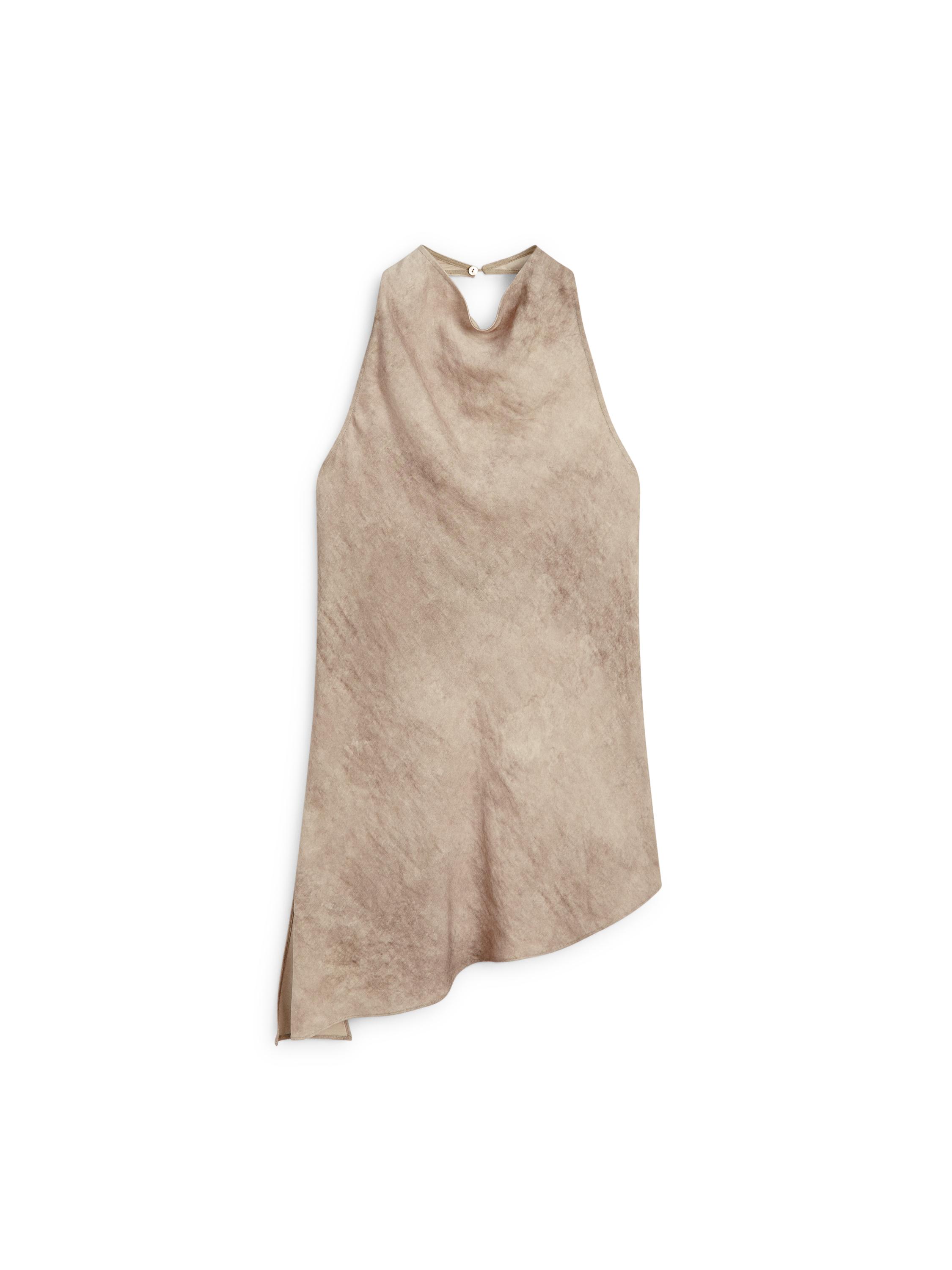 Top cuello halter . Cierre por un botón . Bajo asimétrico. Detalle de espalda descubierta. Acabado desgastado. Dispone de prenda a conjunto.