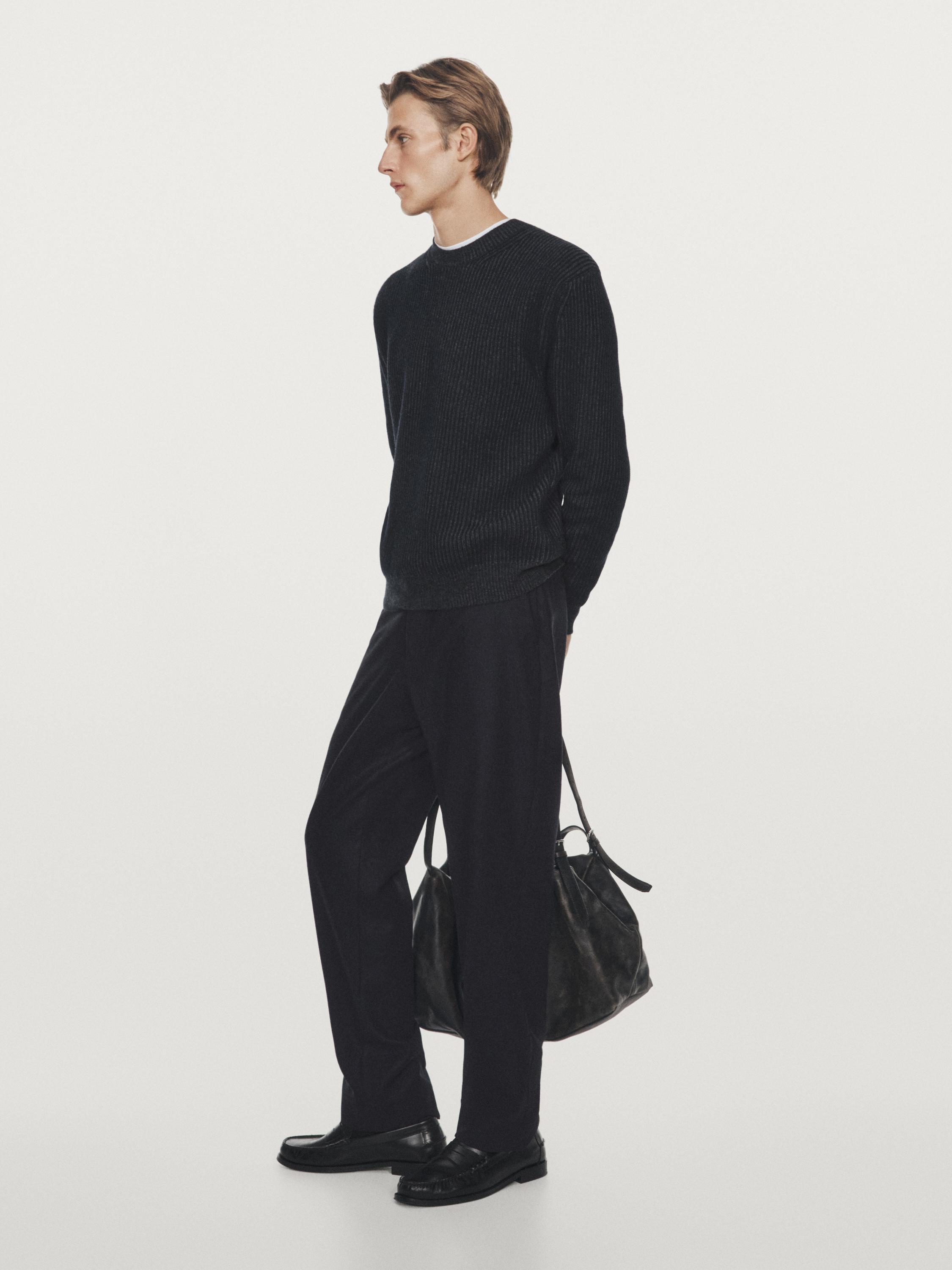 Knit sweater made of a wool blend fabric . Crew neck. Long sleeves. Ribbed trims .
