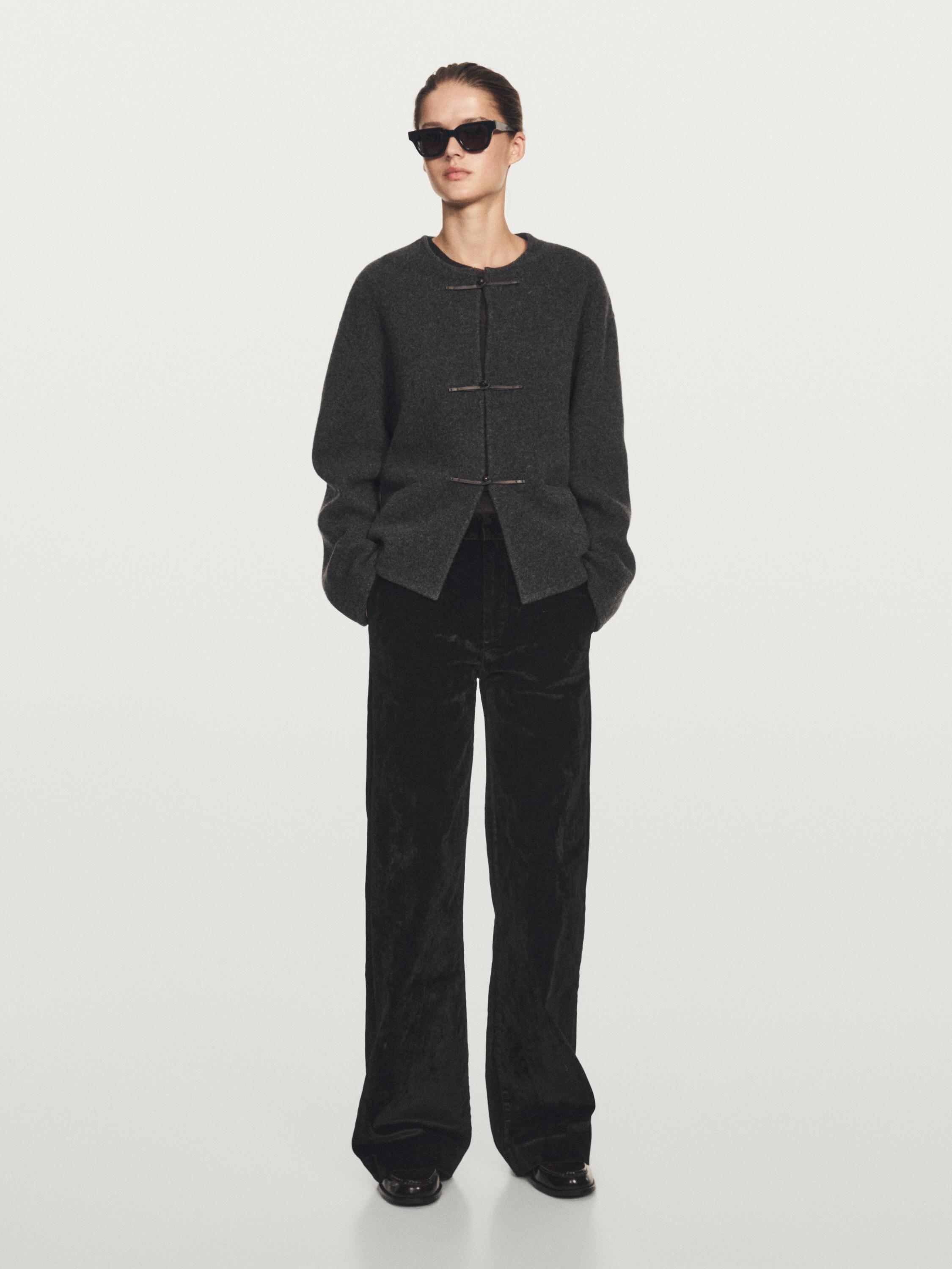Jeansy dzwony: ten krój stopniowo rozszerza się od kolana do kostki, optycznie wydłużając nogi.. Zamek błyskawiczny i zapięcie na rzep z wewnętrznym guzikiem . Dwie boczne kieszenie. Dwie wpuszczane kieszenie z tyłu. Delikatne i przypominające aksamit wykończenie.