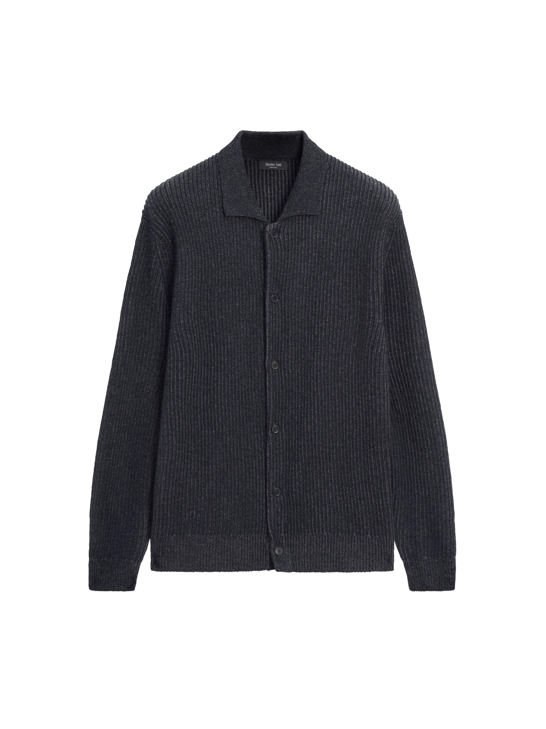 Cardigan confecionado com tecido de malha em mistura de fazenda. Gola camiseiro. Manga comprida. Fecho com botão de fixação à frente. Acabamentos em nervuras .