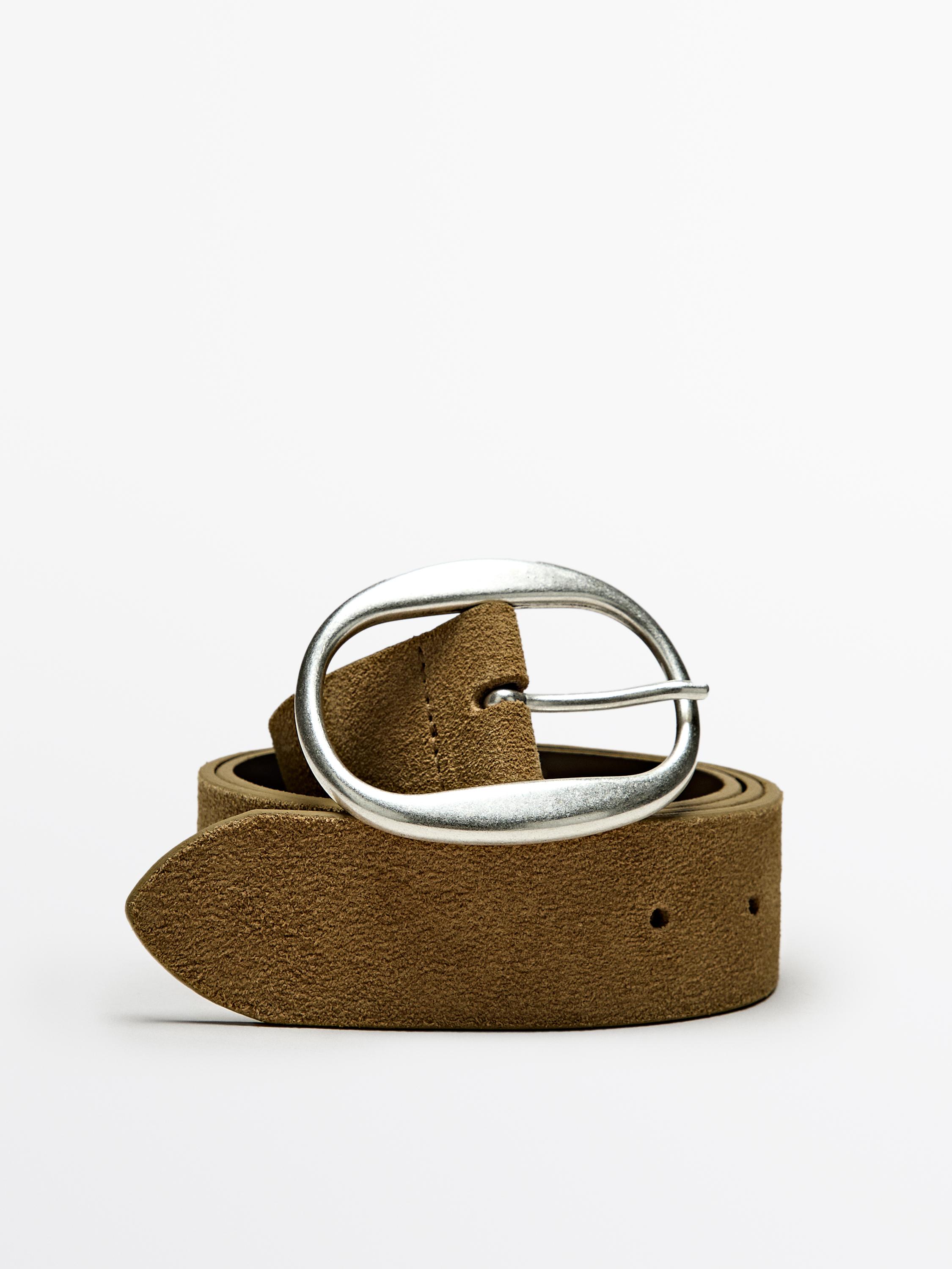 Cinto confecionado com pele bovina e acabamento em croute. Fivela oval grande em metal .