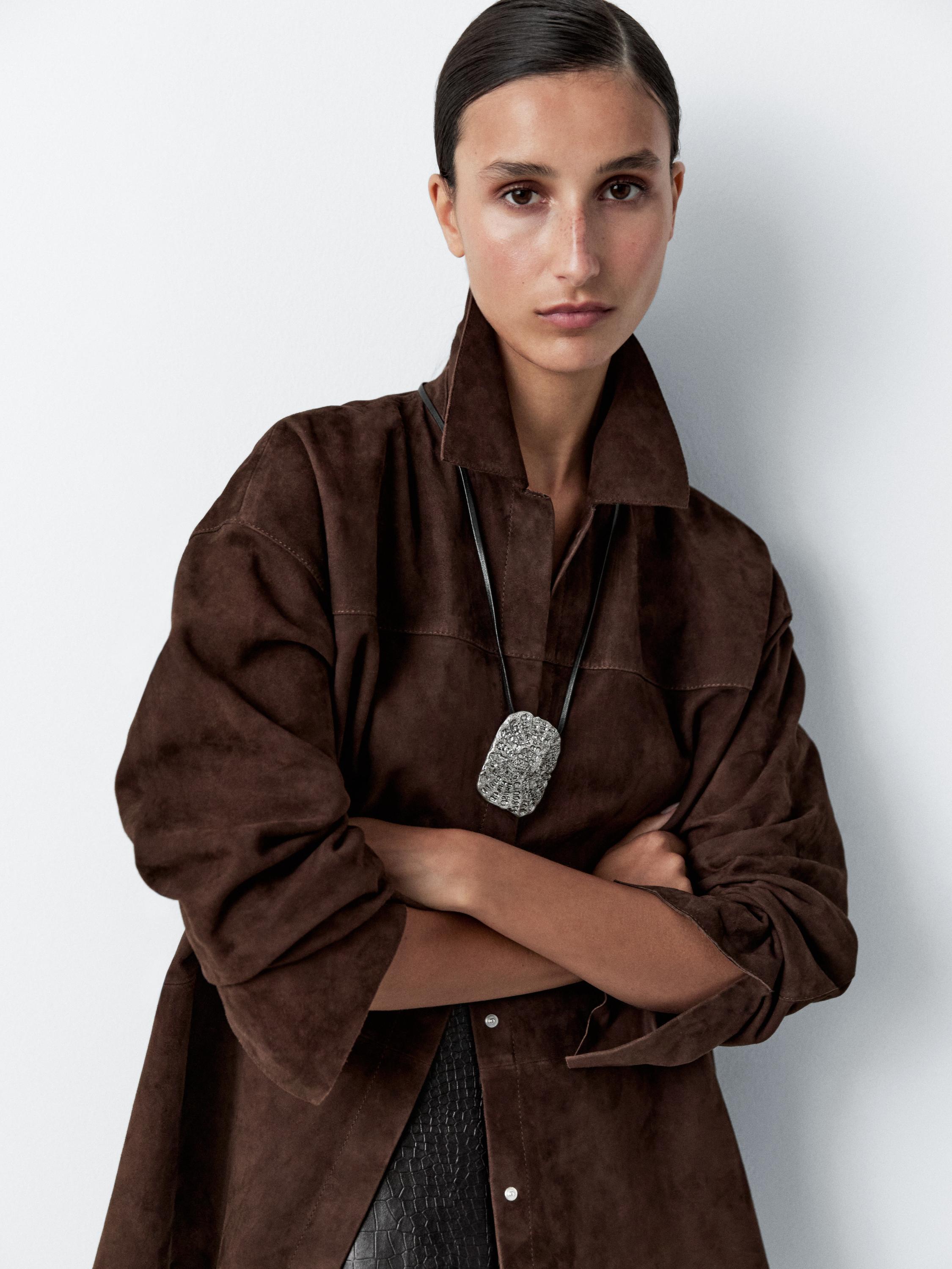 Colar de cordão de pele com terminação metálica . Peça pendente tipo medalhão metálico com textura . Fecho com laçada.