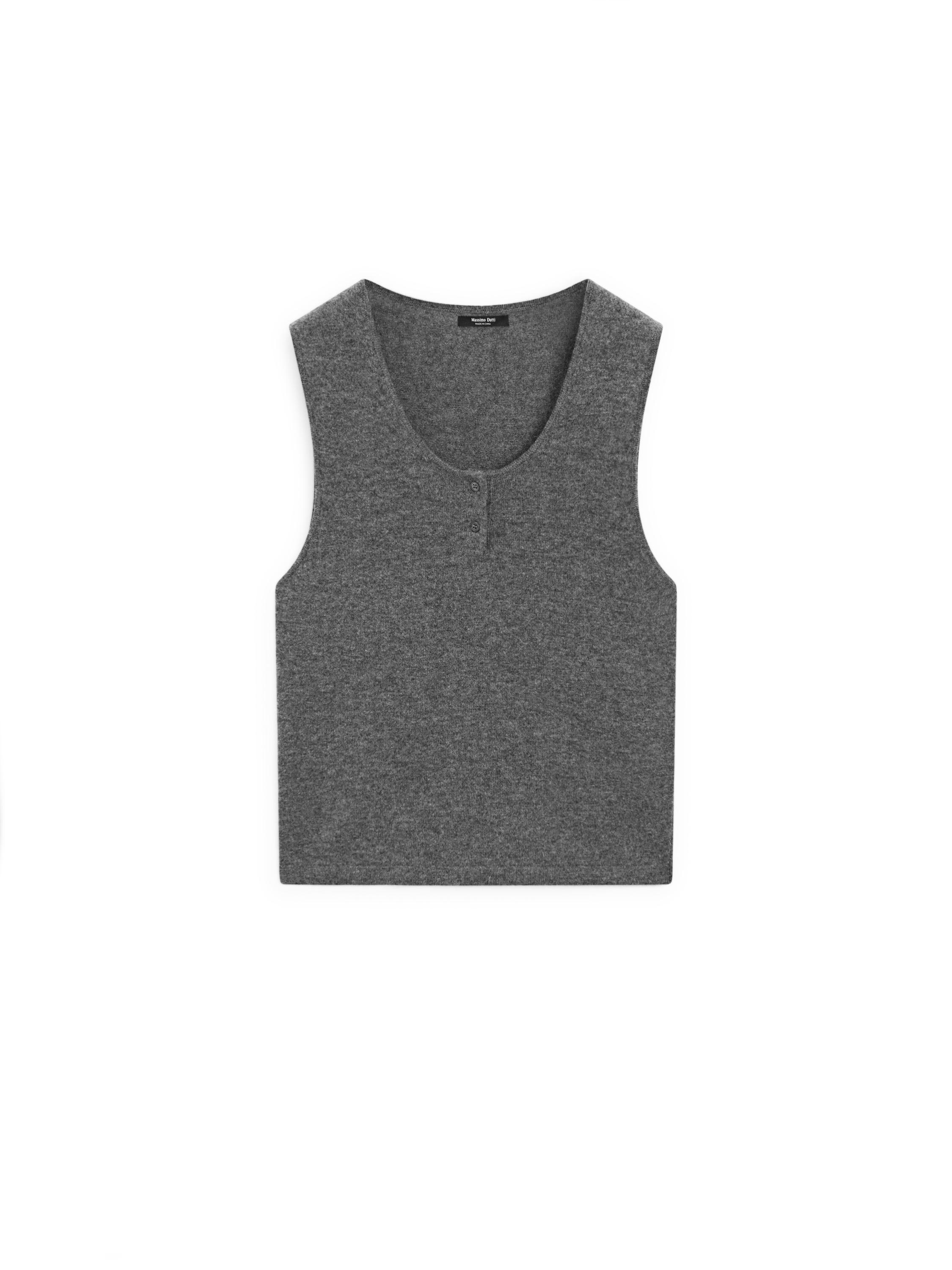 Top confecionado com tecido em mistura de fazenda . Decote redondo. Sem mangas. Pormenor de botões na gola.