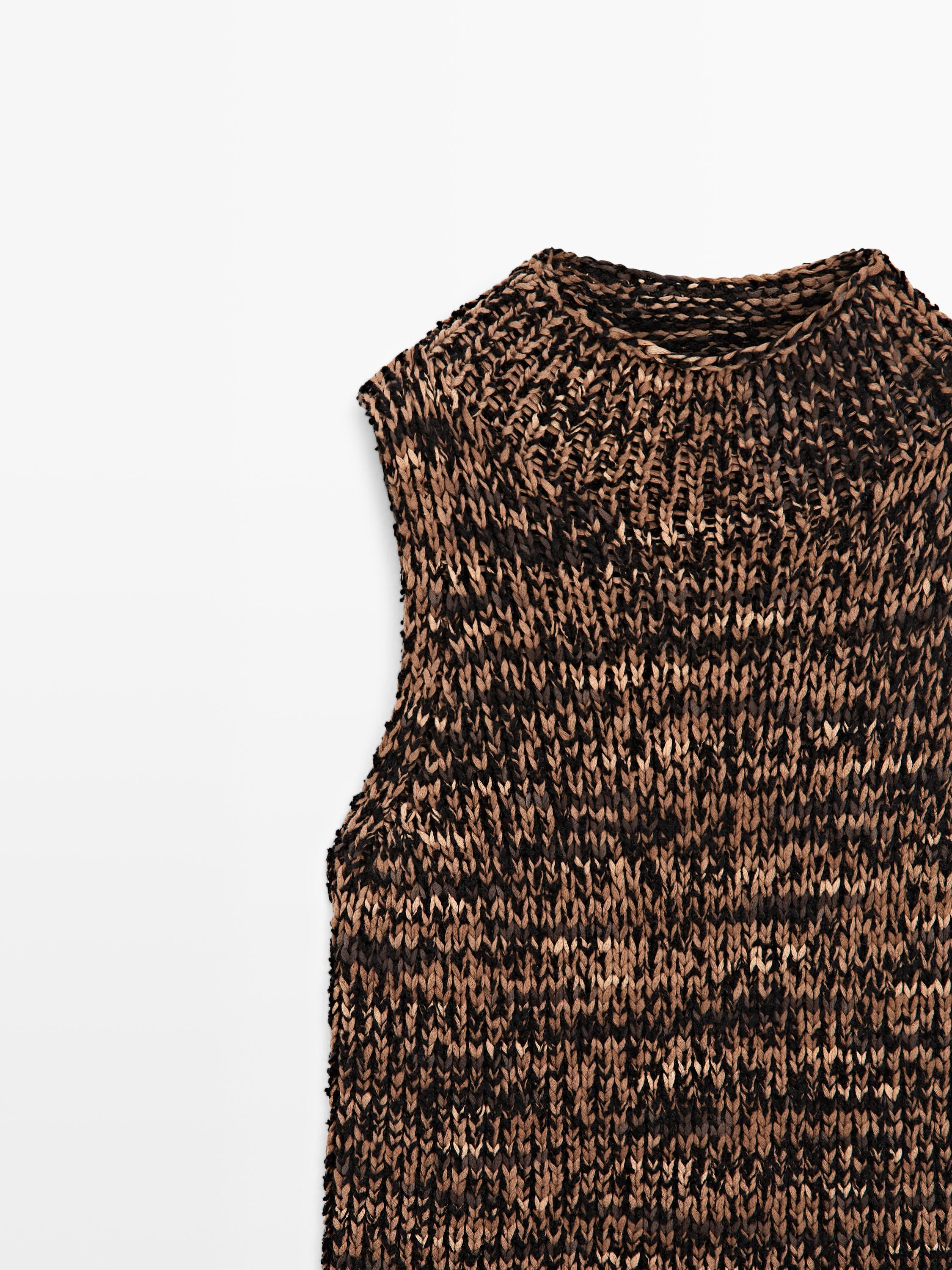 Top com gola halter. Gola alta. Sem mangas. Acabamentos em nervuras . Acabamento efeito jaspeado.