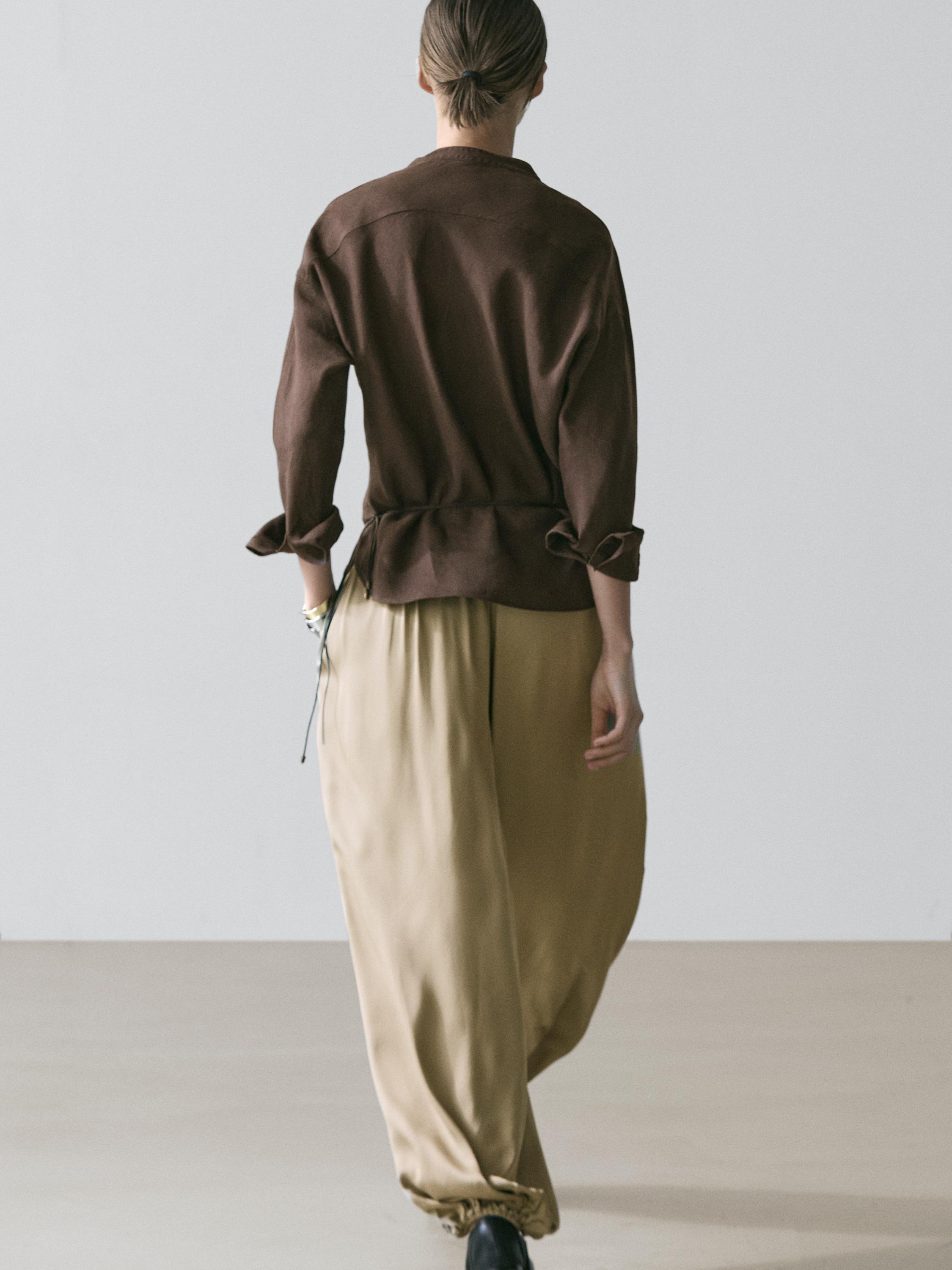 قميص مصنوع 100% من الكتان. أكمام طويلة بأساور بأزرار. طوق مرتفع. زر علوي أمامي.