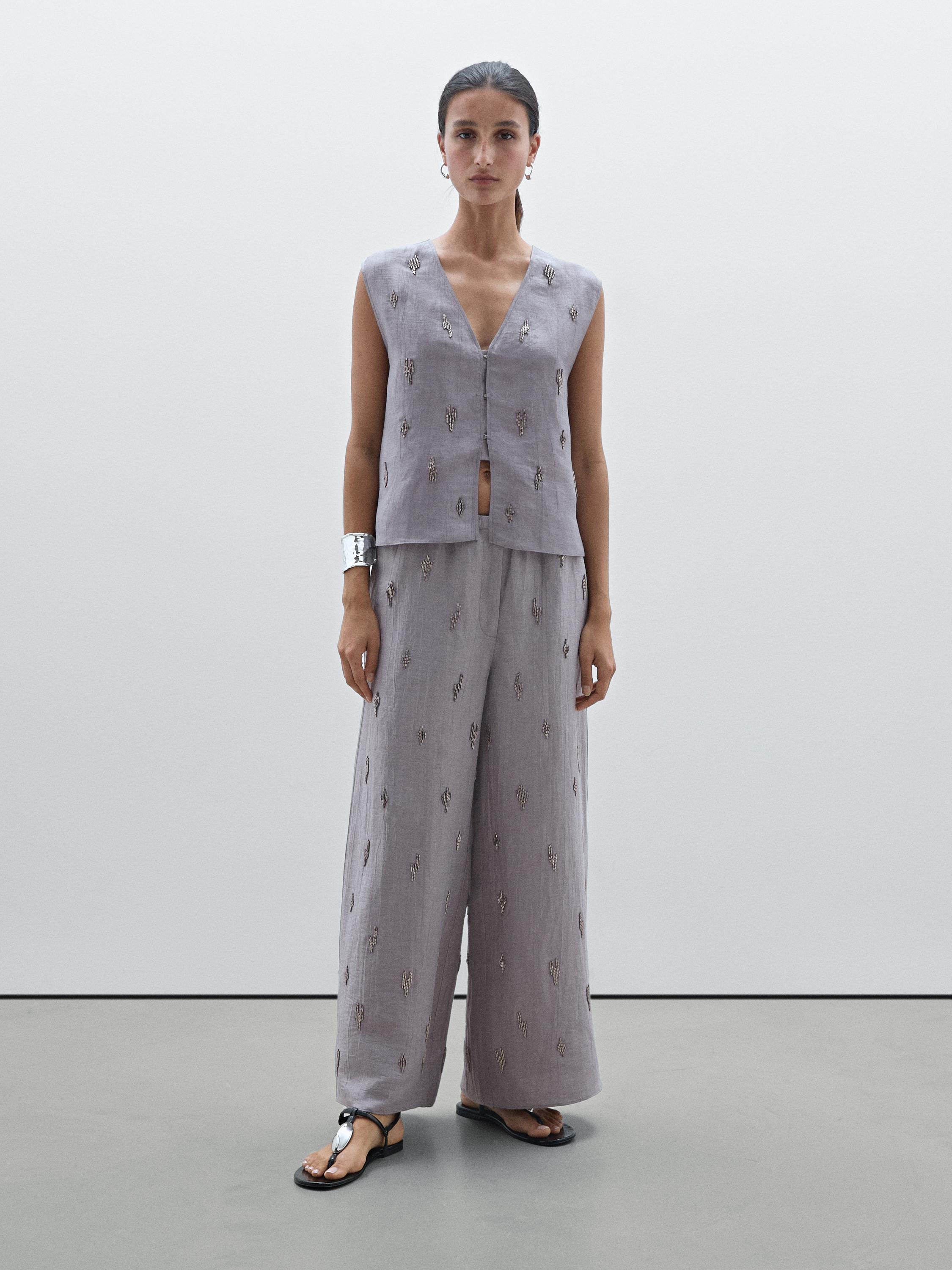 بنطلون فضفاض مصنوع من الكتان المخلوط. تفصيل قماش مرصعة بأحجار صغيرة . سحاب مخفي بفتحة غلق وزر وحزام بشريط تثبيت للإغلاق. تفصيل شريط خصر مرن. متاح قطعة بلون مماثل. تصميم واسع ومريح، غير محبوك.