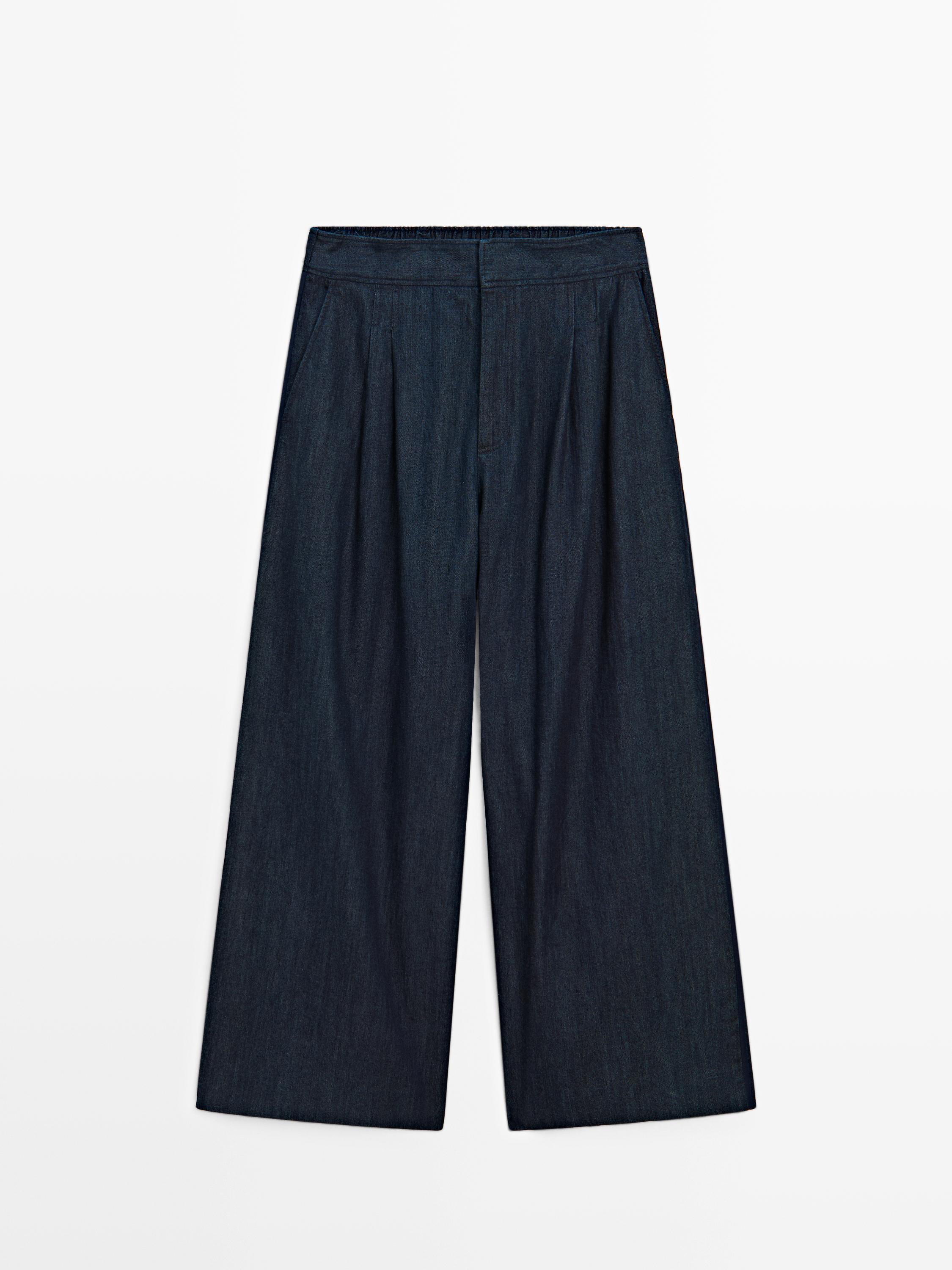بنطلون بساق عريضة مصنوع 100% من قماش دنيم قطني . إغلاق بسحاب مخفي بواسطة فتحة مع مشبك وزر. خصر مرن من الخلف. جيوب على الجانبين. جيبان برقعة في الخلف. تفصيل بحواف بارزة . تفصيل لطية على الصدر.