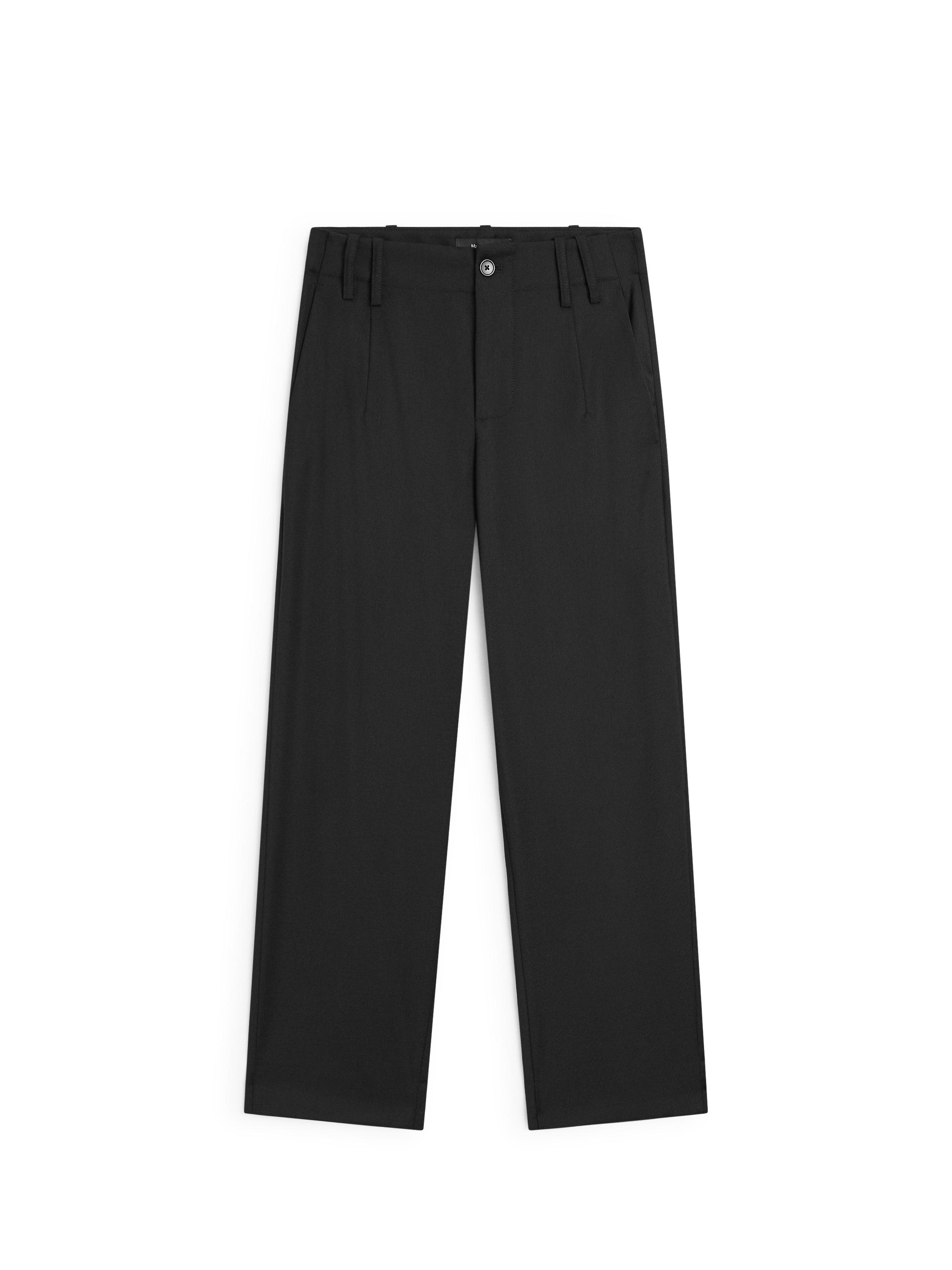 Pantaloni confecționați din țesătură de lână 100%. Betelie cu găici . Boyfriend fit. Două buzunare laterale. Două buzunare frontale cu clapă și butonieră. Cu pense în față și în spate .
