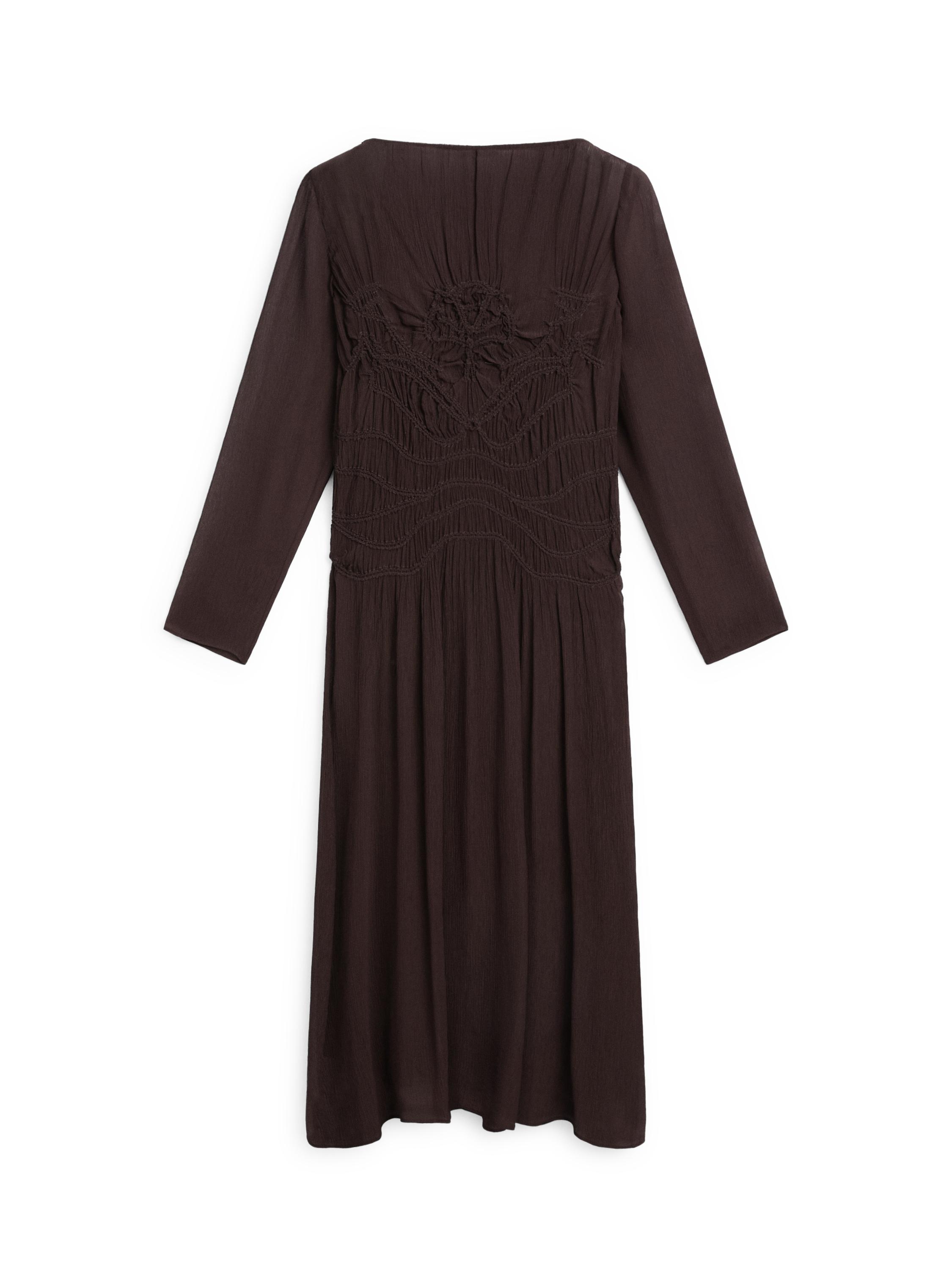 Haljina srednje dužine. Čamac izrez. Dugi rukavi. Površina nabranog efekta.